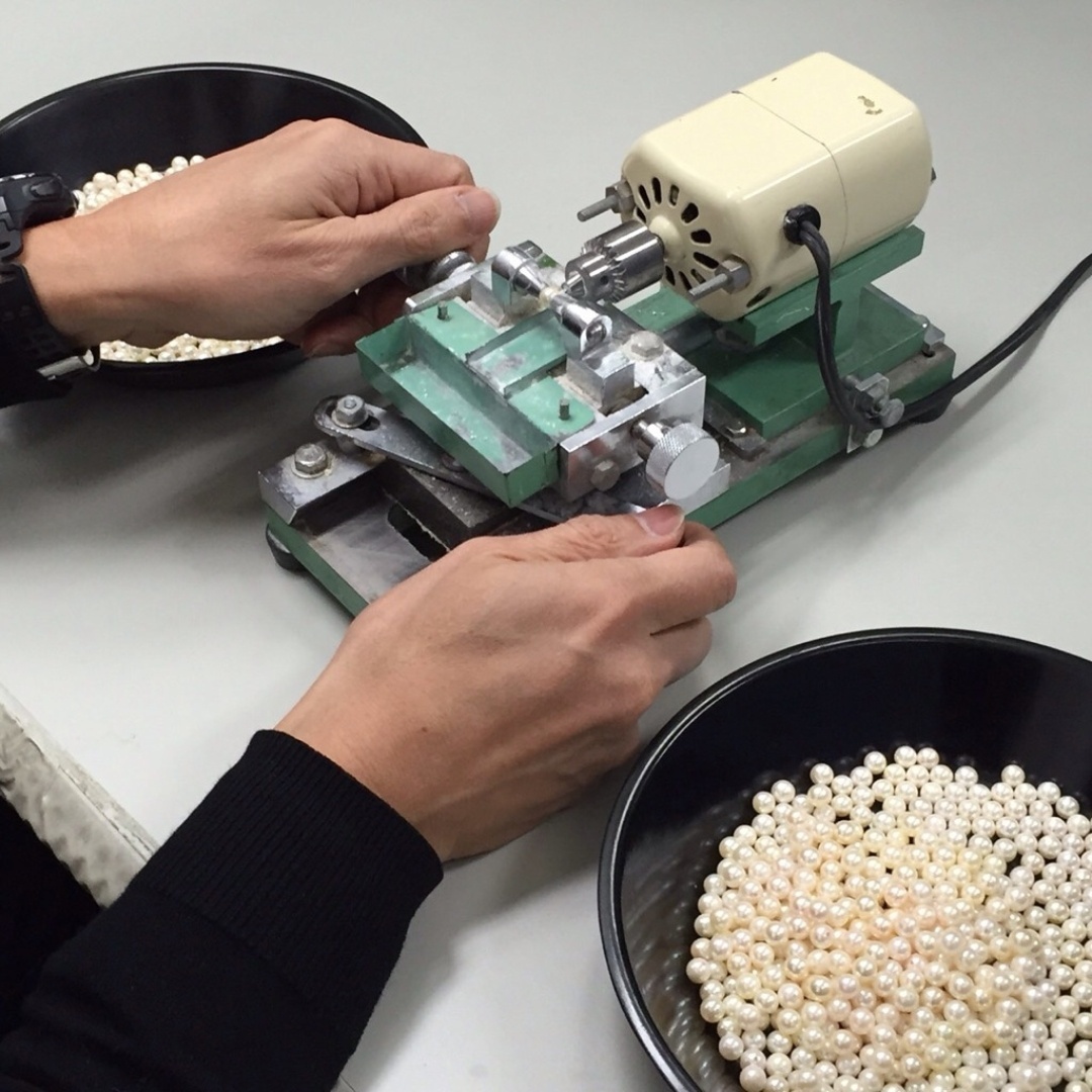 真珠の加工では、「選別」「穴あけ」「染み抜き」「連組み」などすべてのどの工程も非常に繊細な作業で、