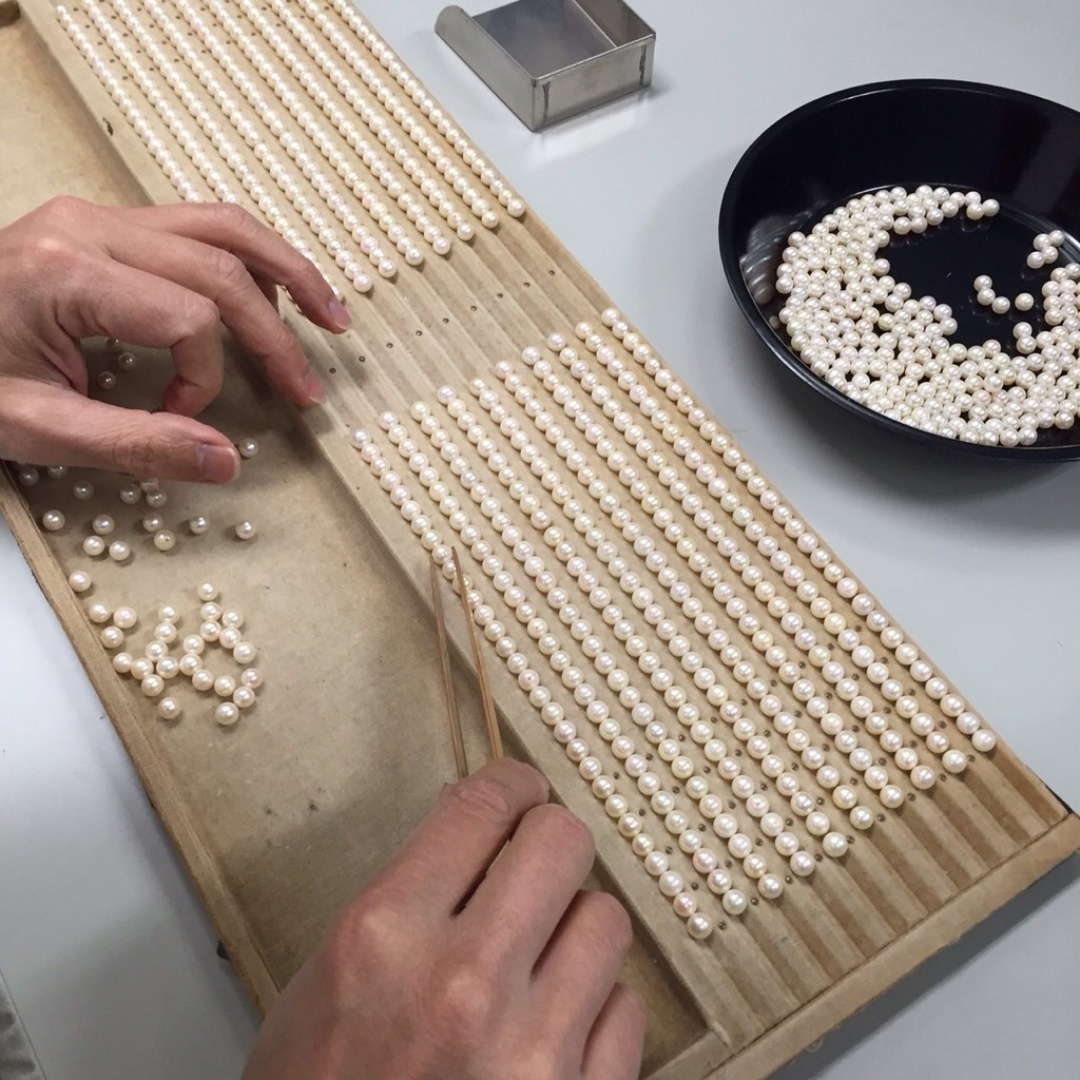 選別作業は真珠屋の基本で、サイズ、色、巻き、照りなどを見極めて一粒ずつ選り分けていきます。