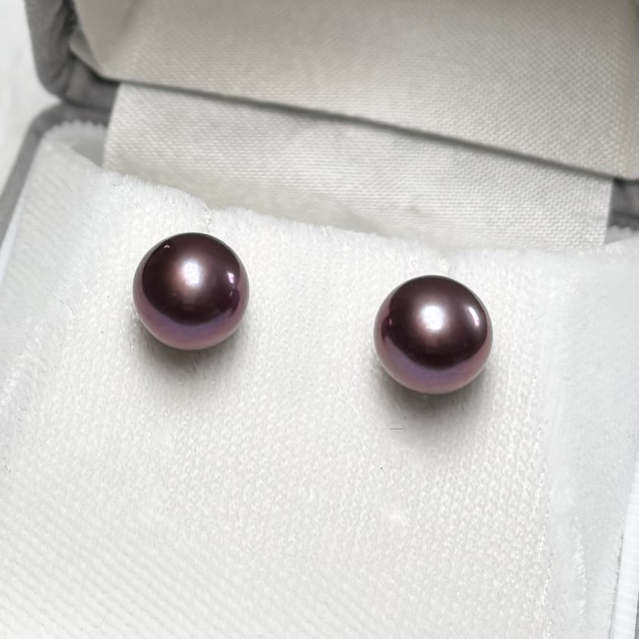 落ち着いたパープルカラーが印象的な、大粒淡水真珠のピアスです。赤みをおさえたシックなトーンで、派手になりすぎず、耳元に上品なアクセントをそえてくれます。角度によってわずかに色のニュアンスが変わり、さりげなく個性のある表情に。