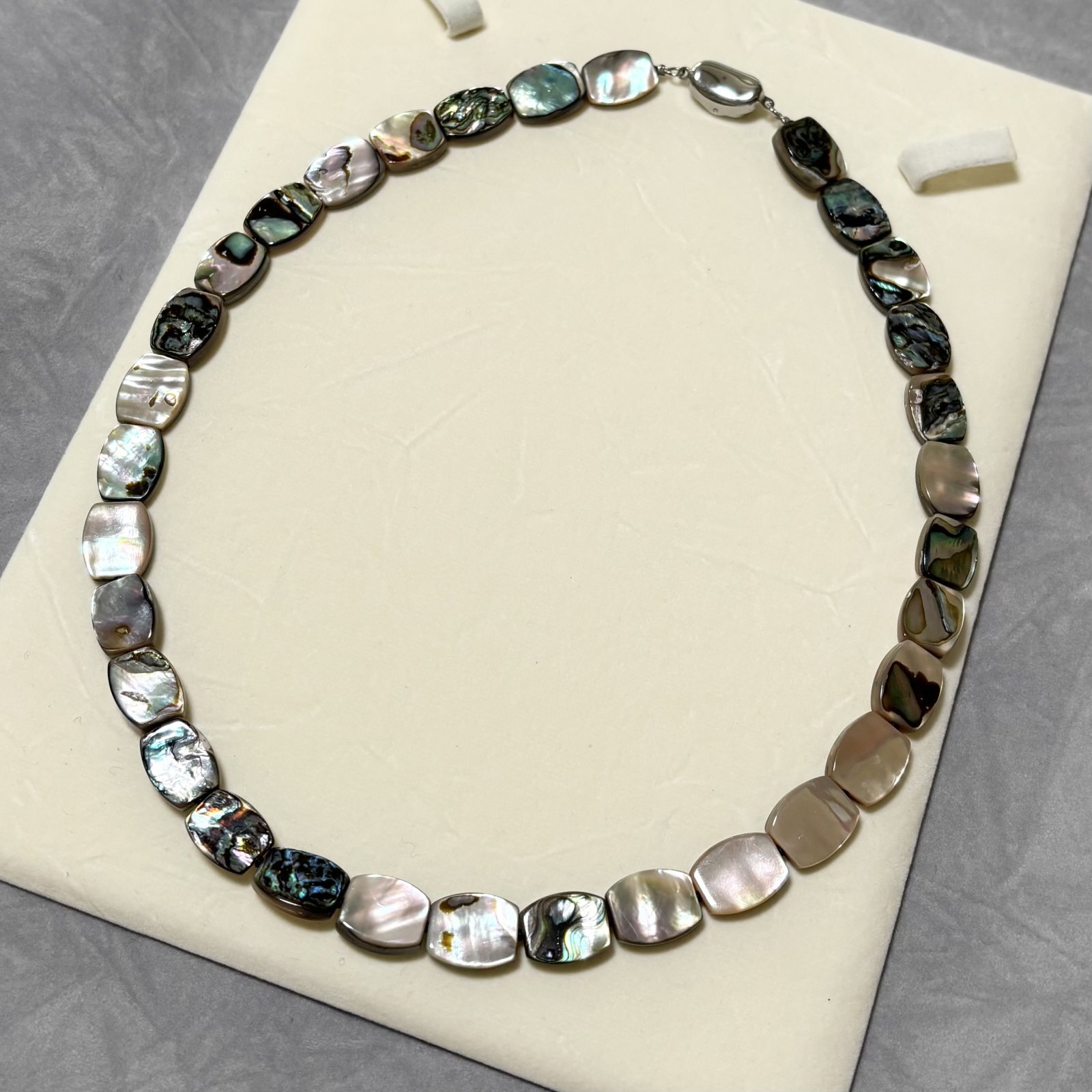 光の当たり方によって表情を変える、アバロンシェルならではの虹色の輝きが首元を印象的に彩ります。