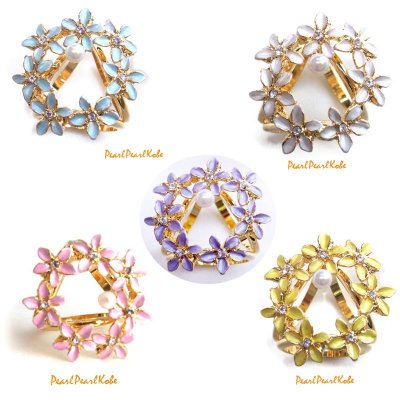 愛らしいチューリップモチーフにアコヤ本真珠がついたスカーフリングです。チューリップや葉は塗になっており所々に散りばめられたスワロフスキーがアクセントになります。白・黄色・紫の3種類があります。 裏は透かしハートになっており、どちらを前にもってきていただいてもご使用いただけます。