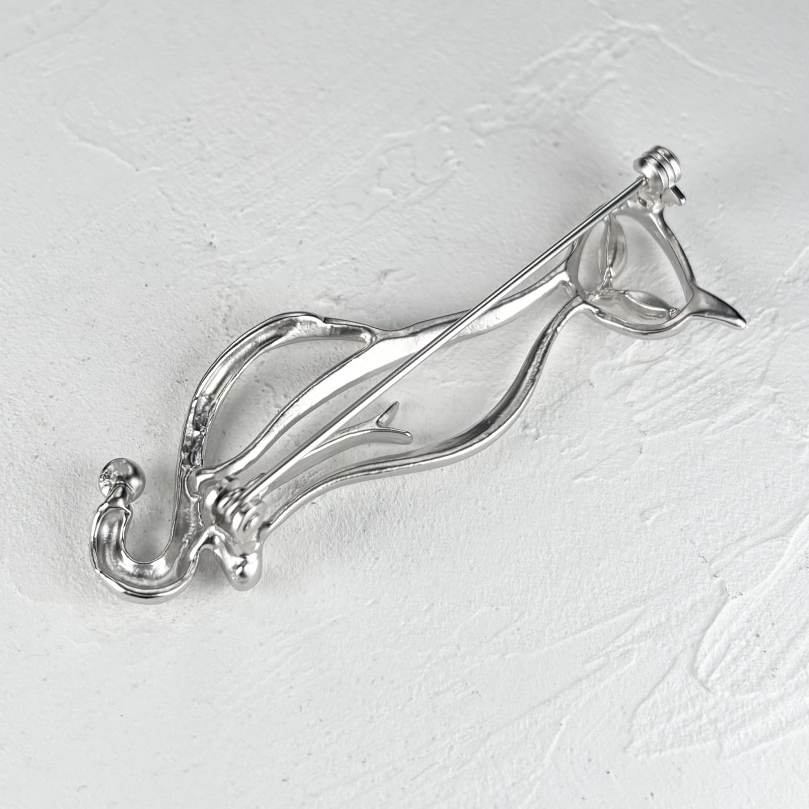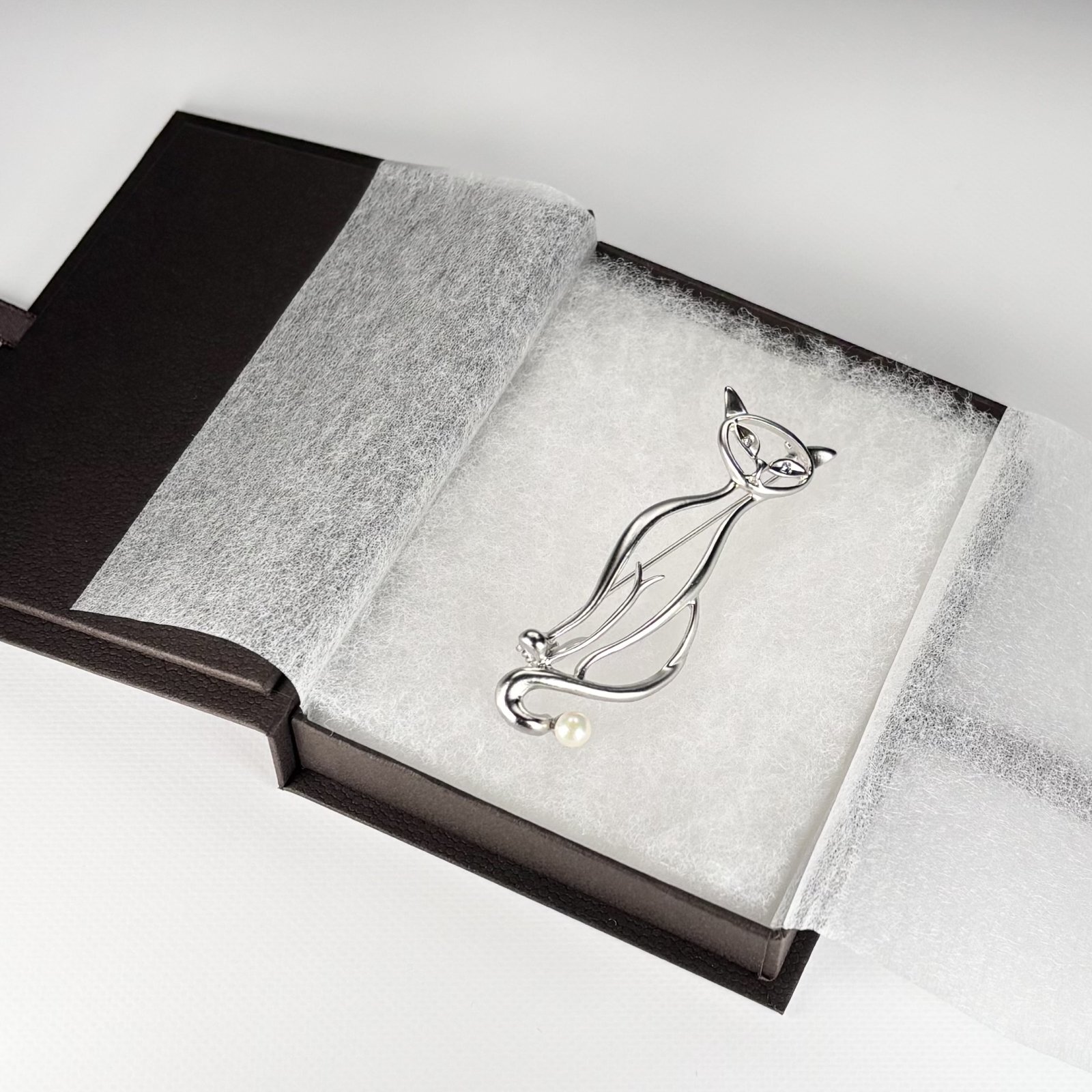 凛としたネコのフォルムに、上品な輝きを放つアコヤ真珠をあしらったブローチ。目元にはスワロフスキーが煌めき、気品と個性を感じさせるデザインです。可愛らしさと上品さを絶妙に兼ね備え、ネコ好きの方にはもちろん、洗練されたスタイルを楽しみたい大人の女性にもぴったり。フォーマルにもカジュアルにも映えるので、日常のお洒落にアクセントを加えたい時や、特別な日の装いにも活躍します。