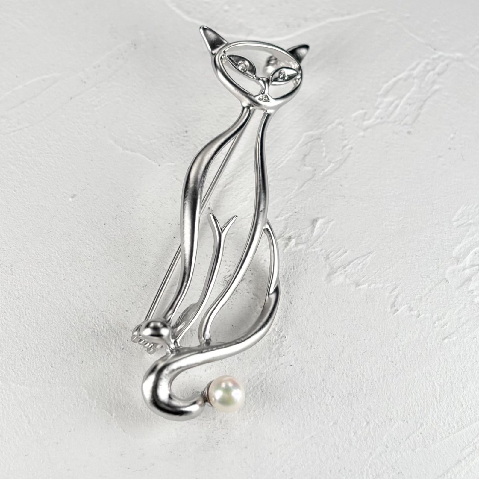 ≪再入荷≫アコヤ本真珠 ネコモチーフ パールブローチ 5-5.5mm ホワイト ラウンド スワロフスキー
