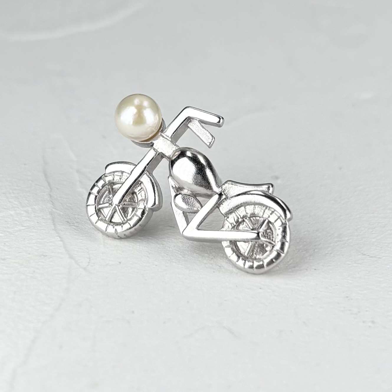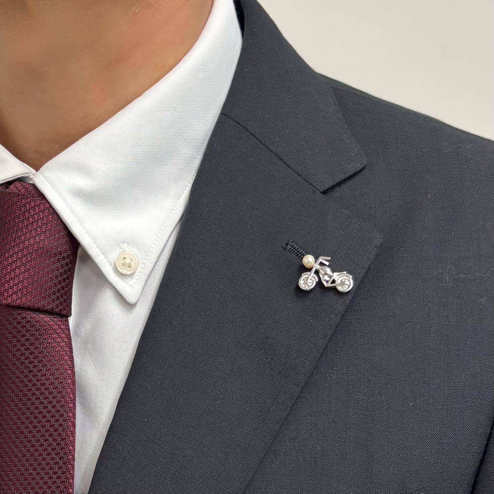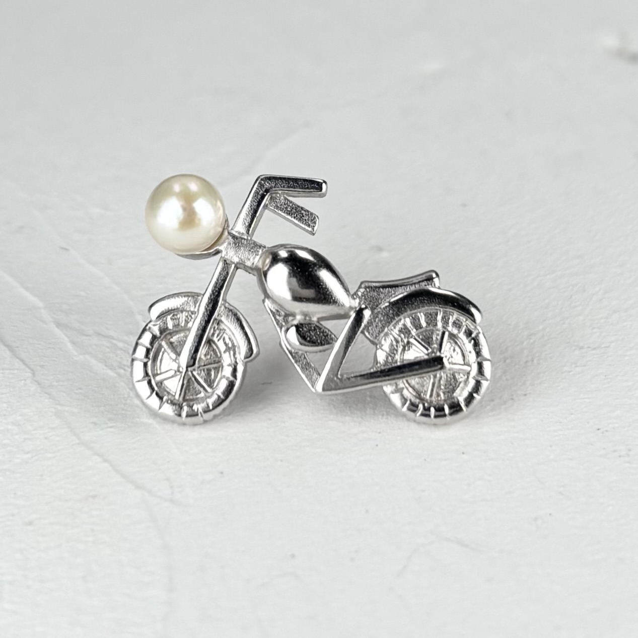 細かいところまで作りこまれたバイクモチーフのパールピンブローチです。遊び心があるデザインです。質感も全体的に落ち着いた感じになっています。真珠は上質なアコヤ真珠をあしらっています。