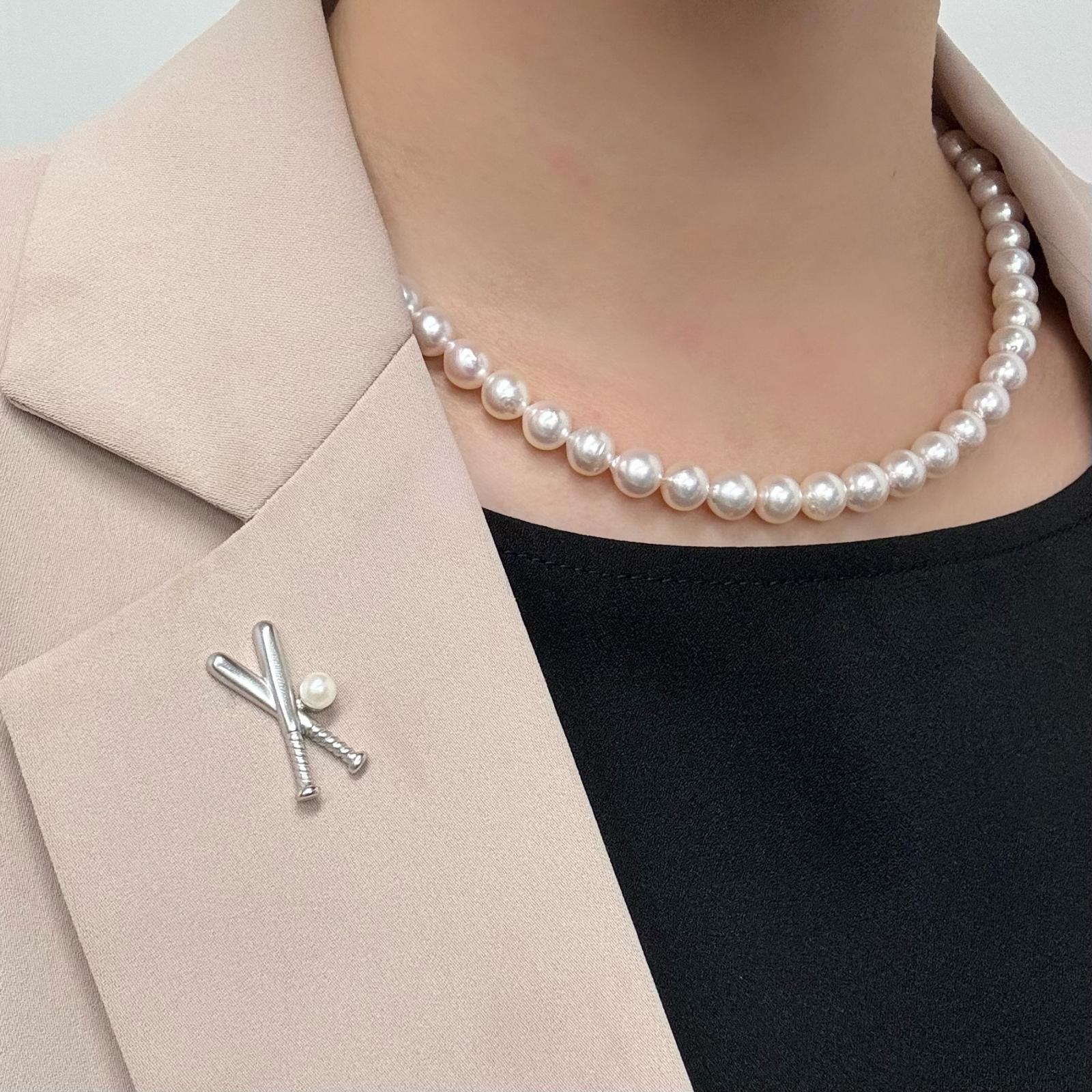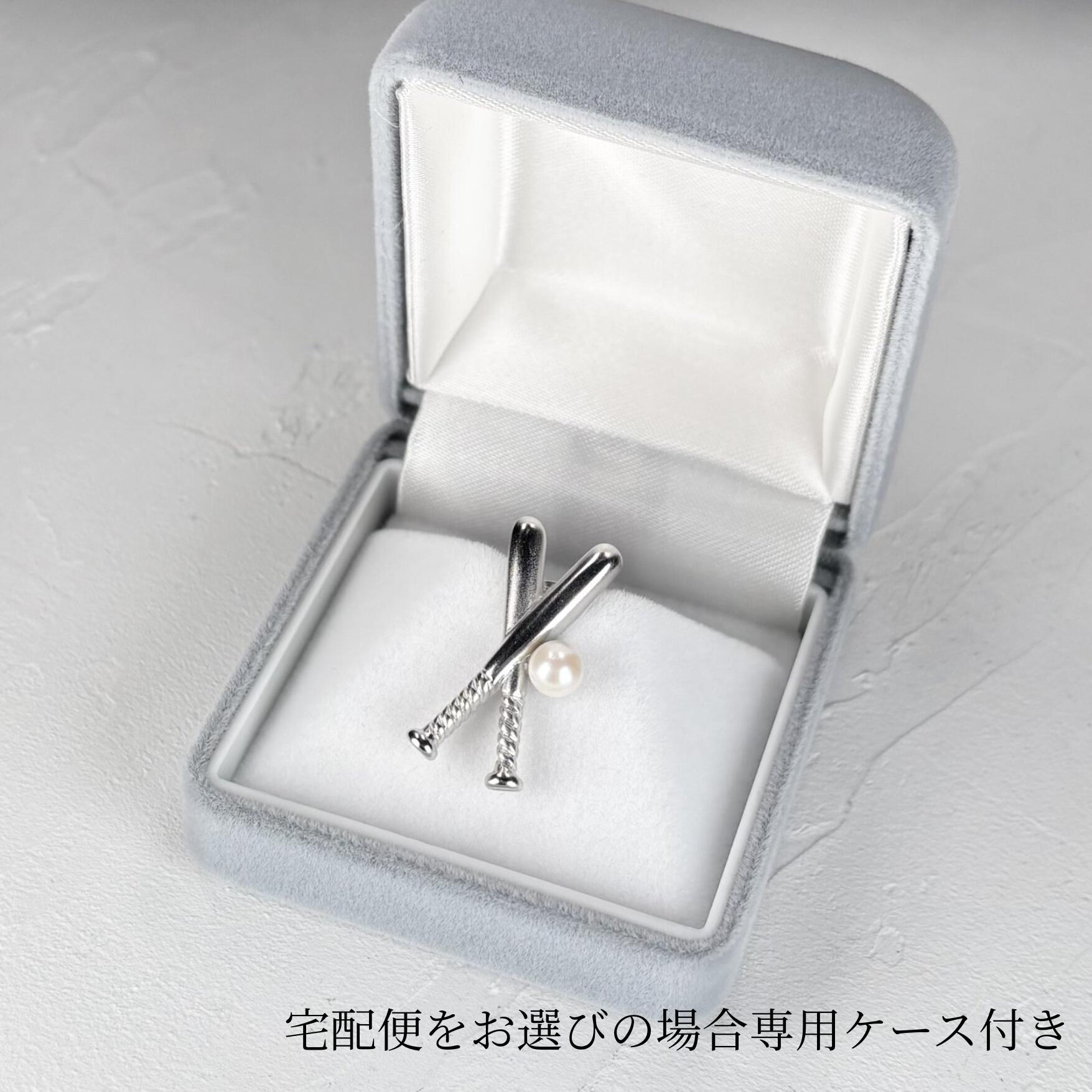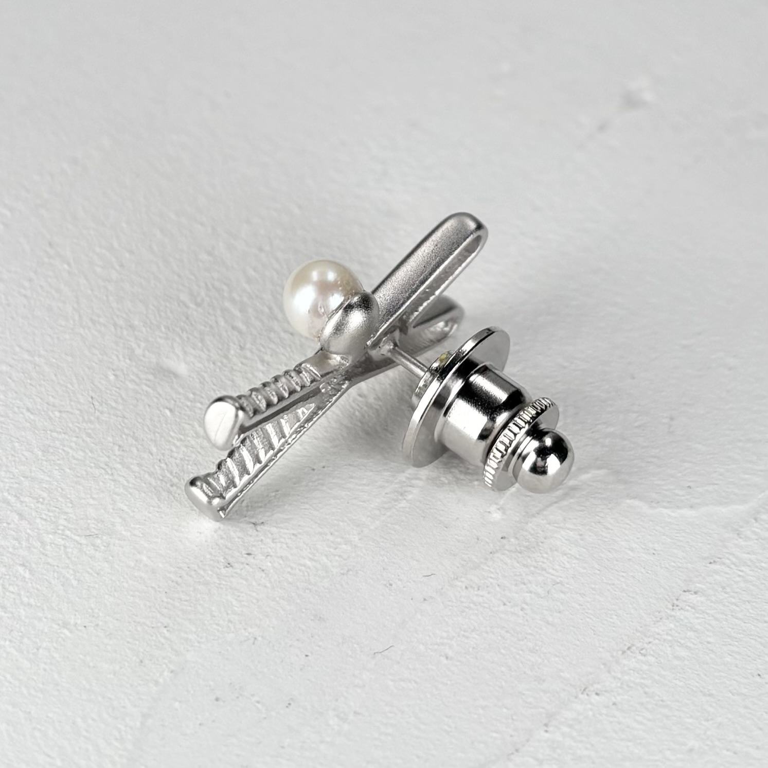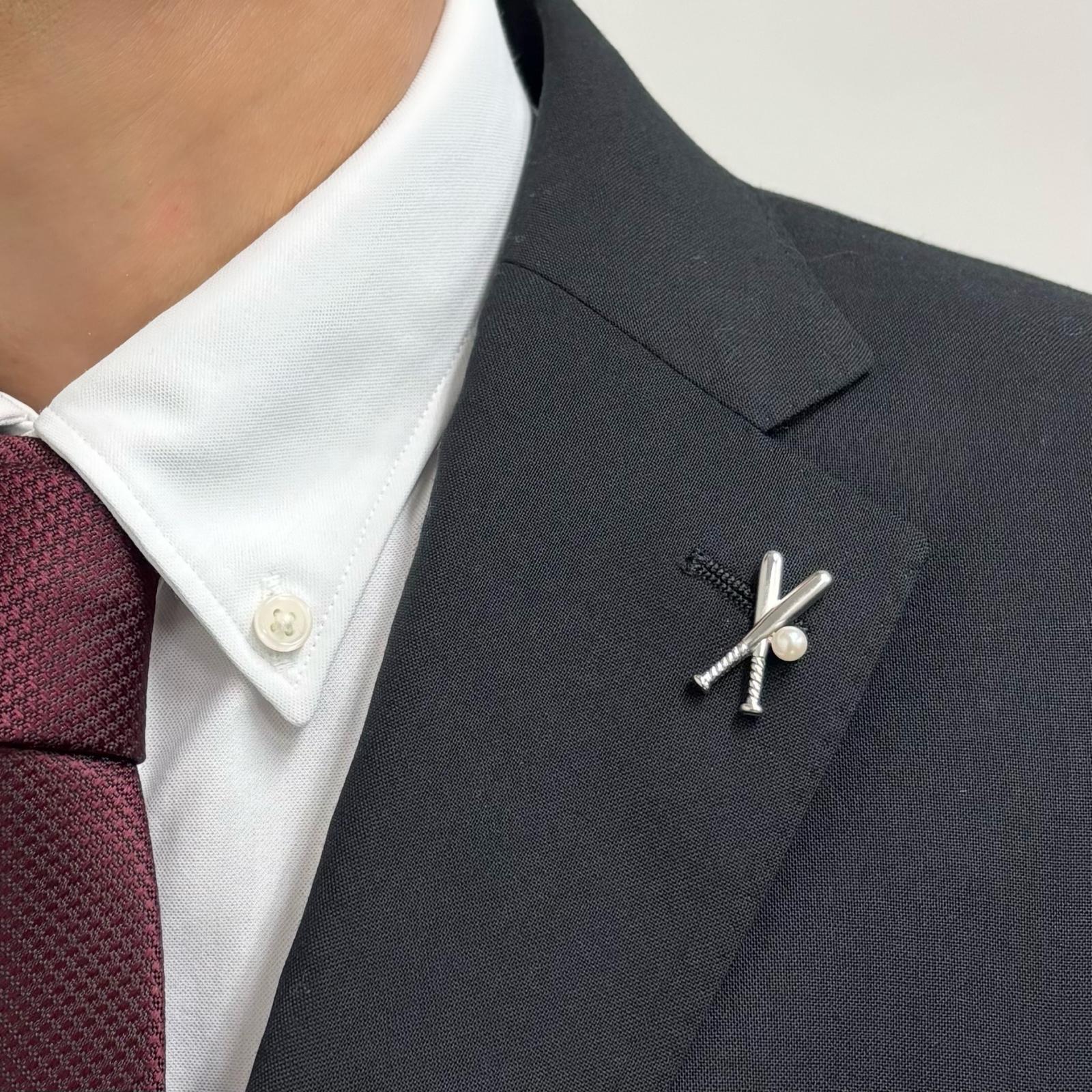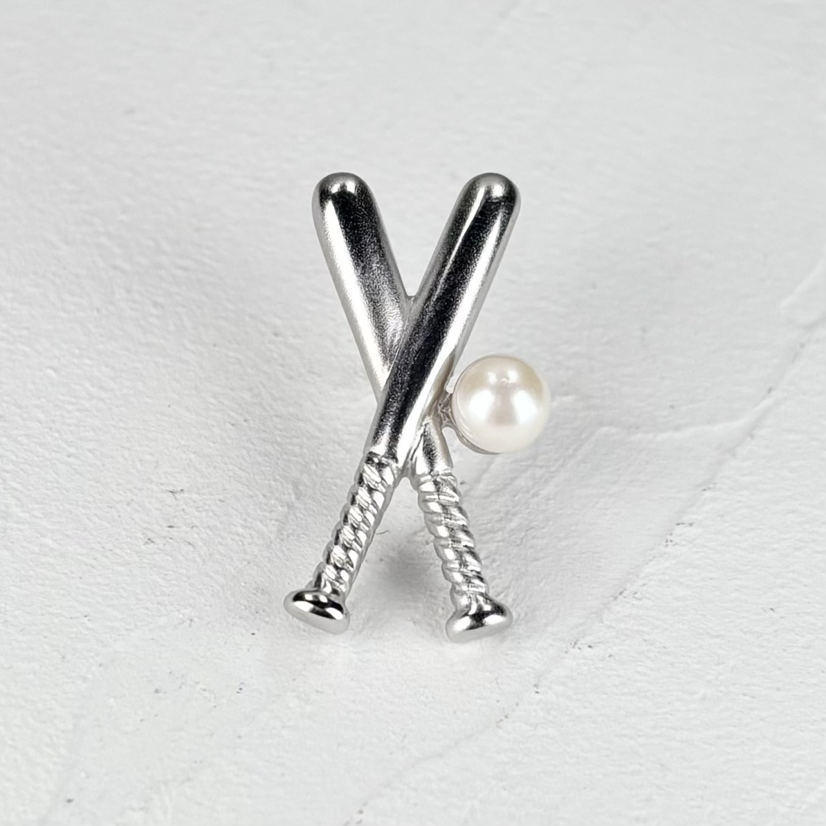 クロスした2本のバットに一粒のアコヤ真珠が煌めく、野球モチーフのピンブローチ。スポーティーなモチーフながら、真珠の上品な輝きが、大人の遊び心を引き立ててくれます。さりげなく野球愛を表現できるデザインで、日常のコーディネートにアクセントをプラスしてくれます。ジャケットの襟元やバック、キャップなど、どこに付けても馴染む小さめのサイズですので幅広いスタイルにお使いいただけます。ユニセックスで使えるデザインは野球好きな方への贈り物や記念日のギフトにもぴったりです。