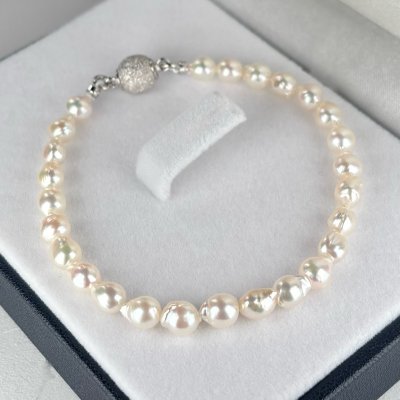 ナチュラルバロックとはアコヤ本真珠のナチュラルグレーでかたちがバロックのことを表しています。 ナチュラルグレーは偶然にできた自然の色でとれる量が少なく希少です。染めている真珠と違い内側から輝く美しさが特長です。 バロック真珠とは一般的な真円ではなく形がゆがんでいる真珠です。真珠層の巻きが厚いので輝きが強いです。 また個性的な形をしているので、1つとして同じものはありません。ナチュラルカラーのバロック真珠はとても珍しく扱っている真珠メーカーも限られています。