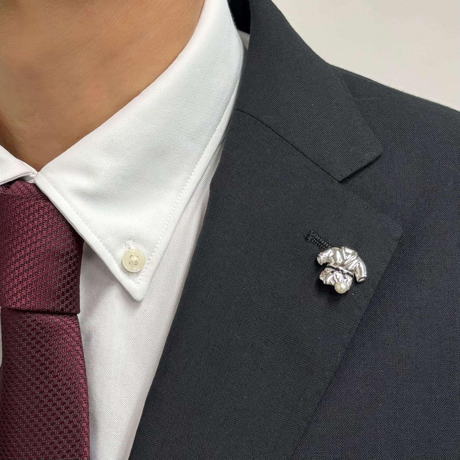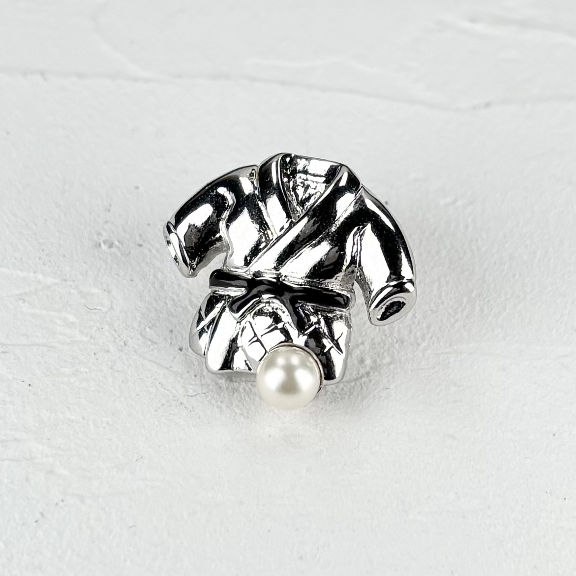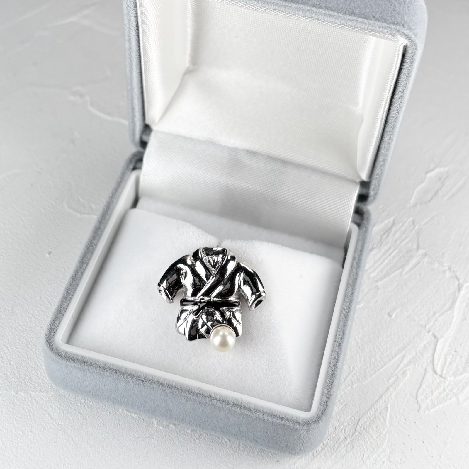 黒帯をした柔道着モチーフのパールタックブローチです。真珠は4-4.5mmの上質なアコヤ本真珠をあしらいました。マットな質感ですので落ち着いた印象があり、年齢や性別を問わずお使いいただけます。