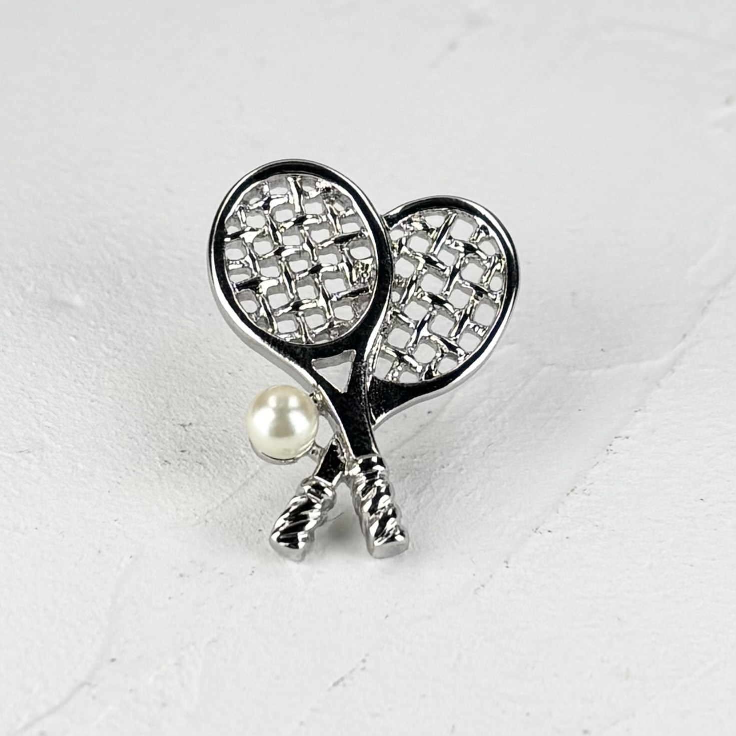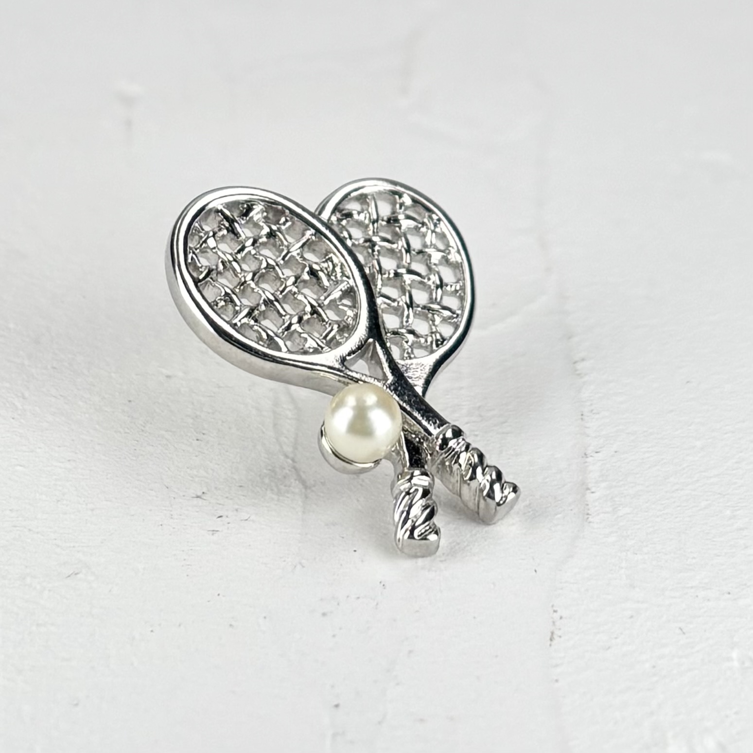 テニスラケットをモチーフにした、遊び心のあるデザインのピンブローチ。ラケット横にはボールに見立てたアコヤ本真珠ベビーパールを添え、さりげない上品さをプラスしました。