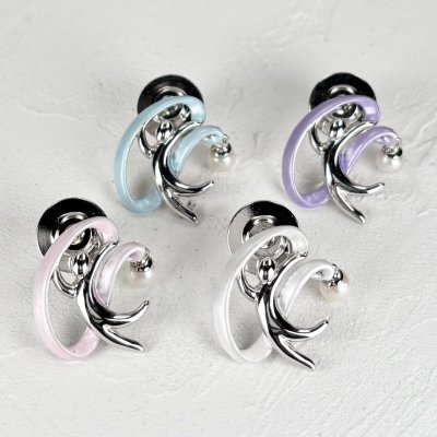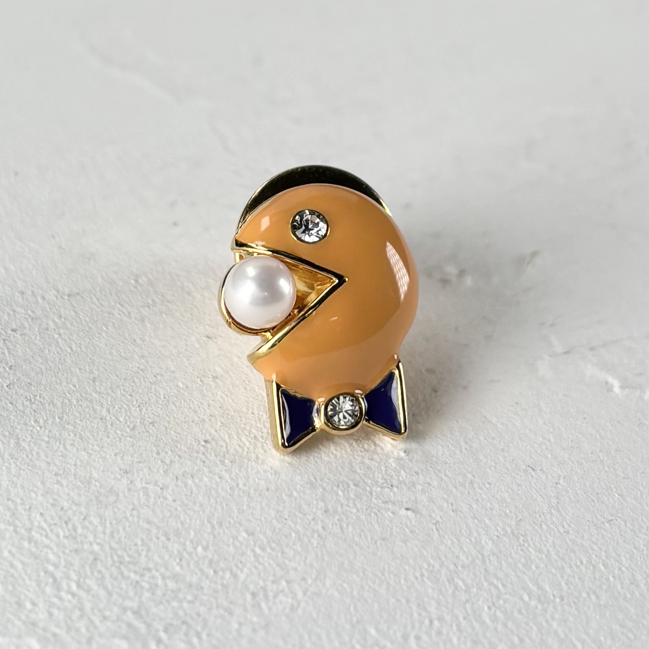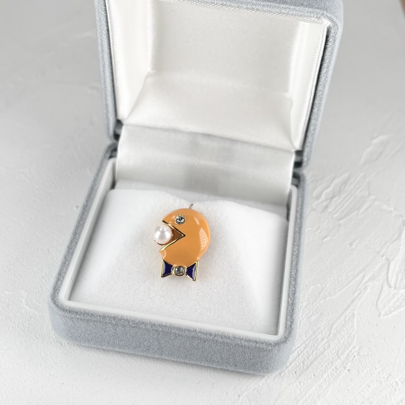 スマイルが真珠をパクっとくわえたユニークなデザインです。口の大きさに合うようにあしらった4-4.5mm上質なアコヤ本真珠と蝶ネクタイがアクセントになっています。横から見た際に半円にして正面からみても丸くなるようにしました。全体的に丸いフォルムでかわいらしさを出しつつもシンプルなデザインですので男女兼用でお使いいただます。