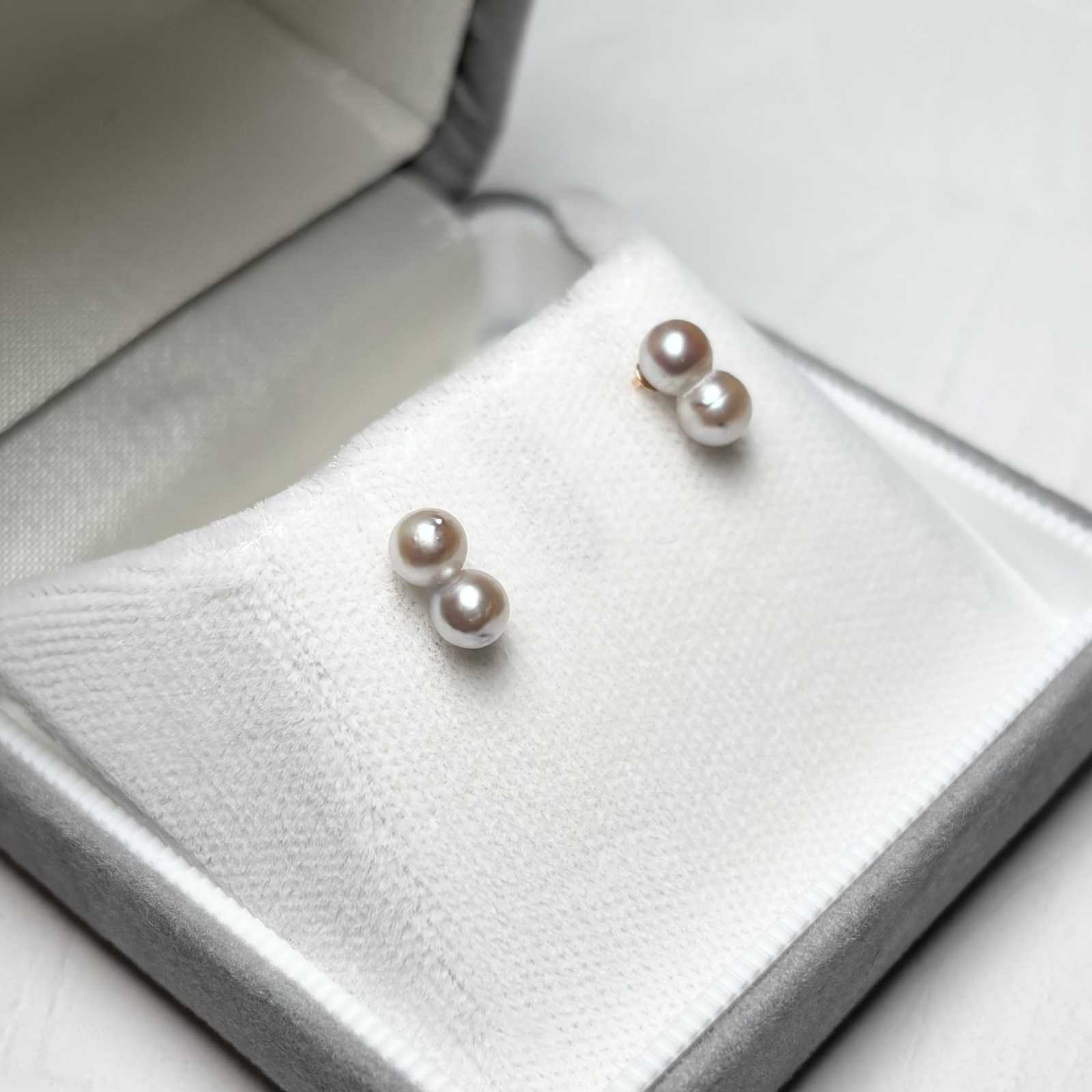 素材はK10PG、K14WG、K18YGからお選びください。キャッチは落下防止の為に、シリコンゴムにキャッチが埋め込まれたタイプを使用しています。特別な日や普段使いはもちろん、オフィスワークや商談、可愛さをひめた上品さがオススメです。ツインパールはその形から愛や絆の象徴といわれています。自分へのご褒美や大切な方への贈り物にもオススメです。
