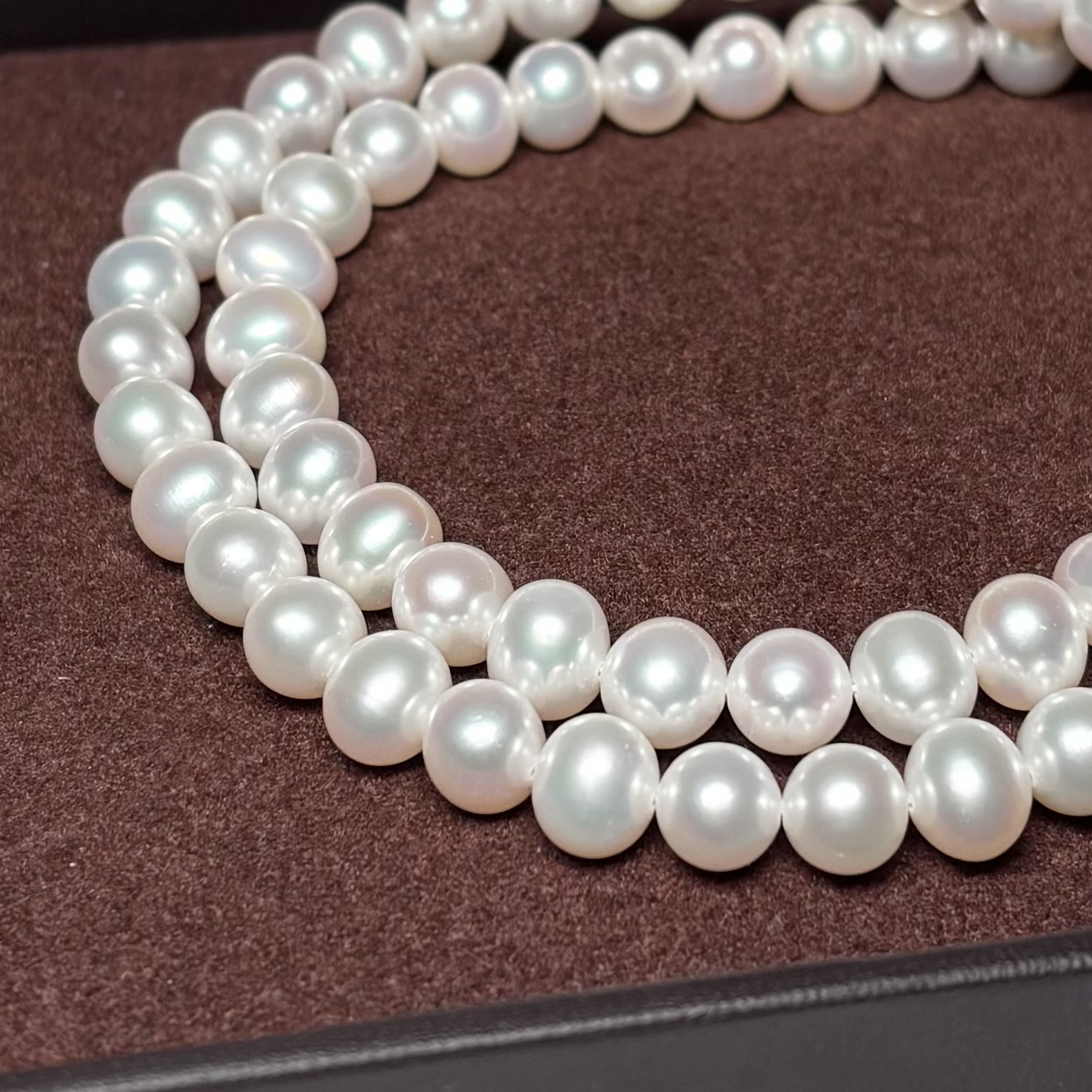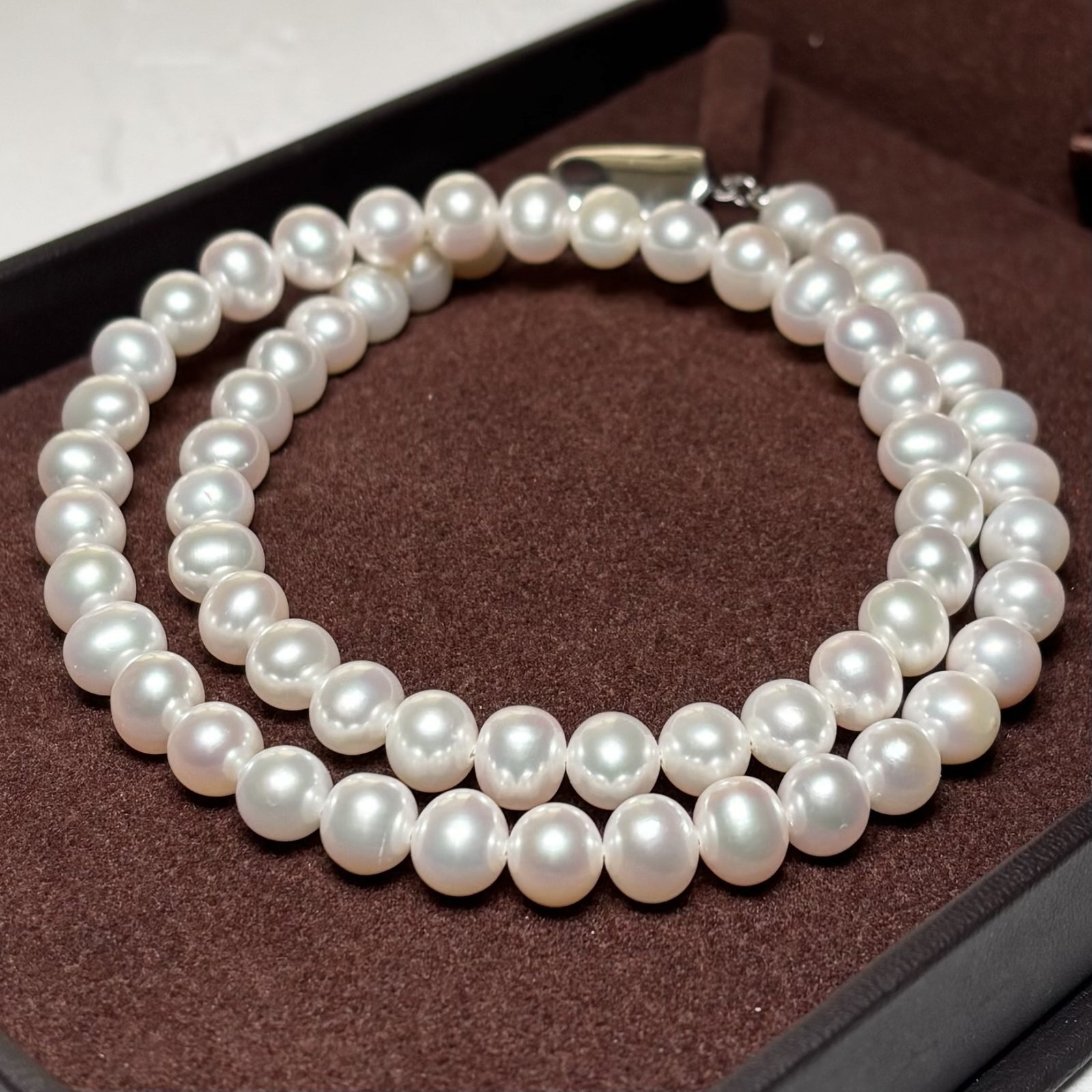 色艶の良い上質な淡水真珠を使用したパールネックレスです。定番のホワイトカラーは冠婚葬祭やフォーマルな場面に使いやすく、ひとつ持っていると重宝する一本です。淡水真珠は汗や水にも比較的強いため、カジュアルな装いにも気兼ねなく取り入れていただけます。