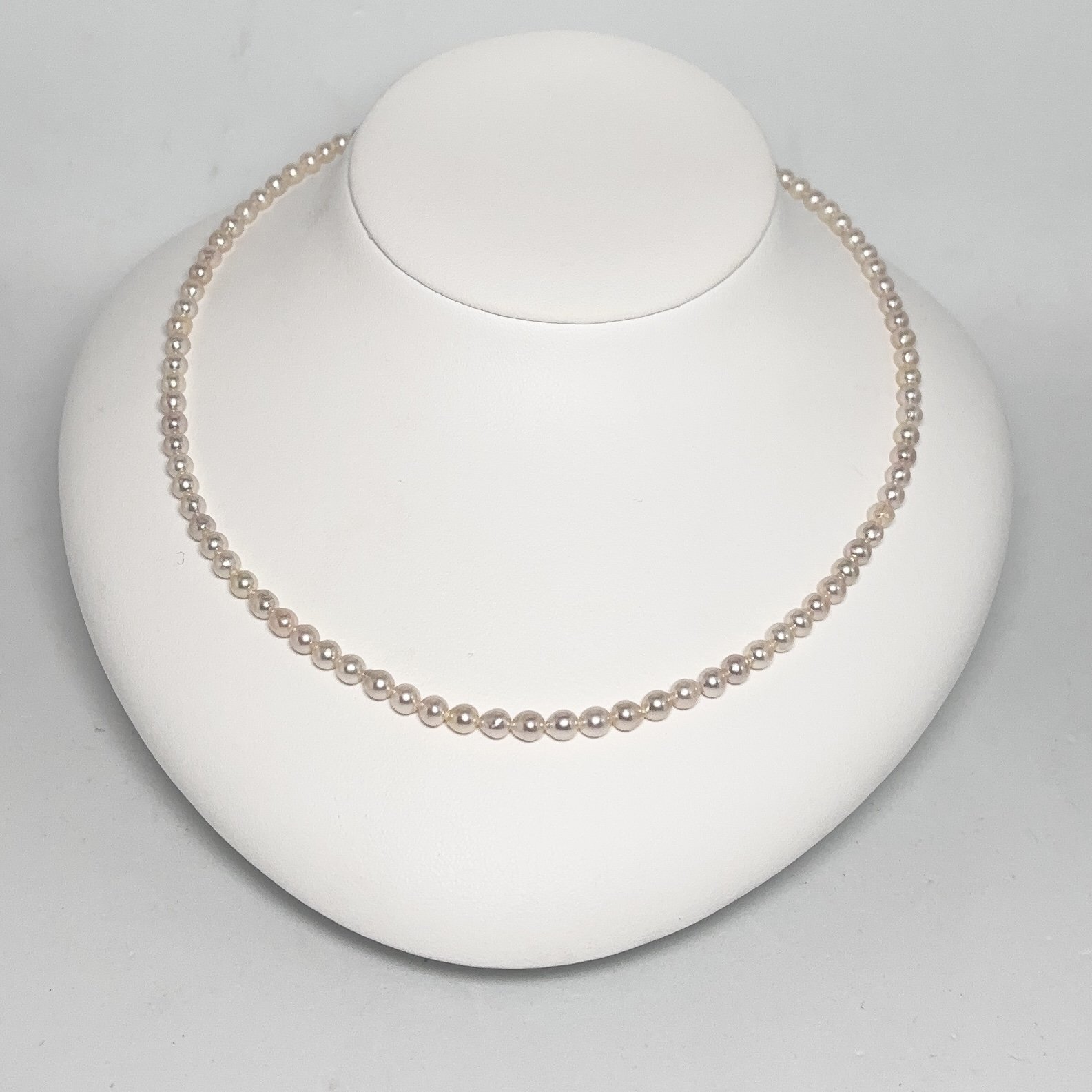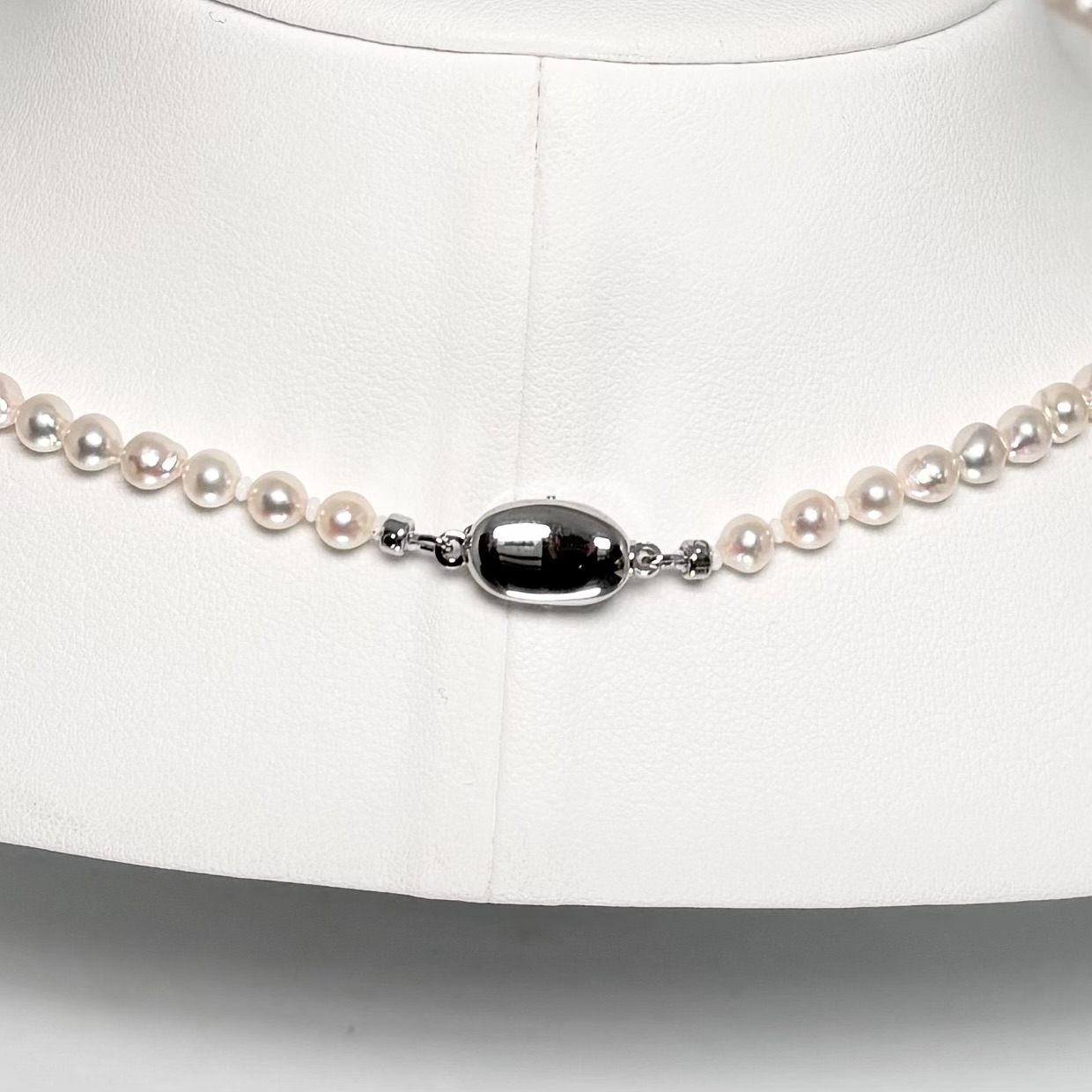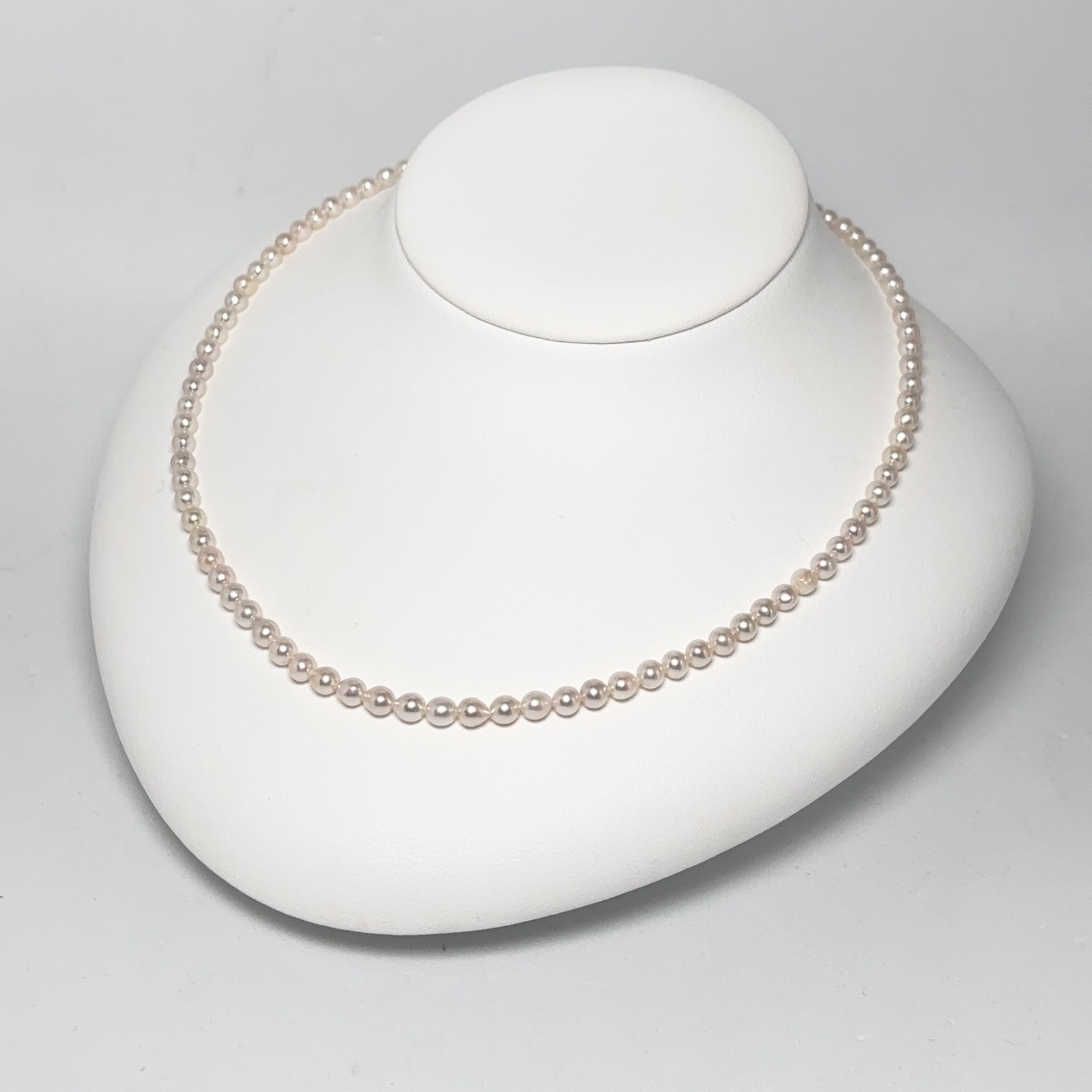 ほんのりピンクがかったホワイトパールは肌なじみが良く、デコルテをやさしく上品に彩ります。日常の中で気軽に本物の輝きを楽しみたい方に、ぜひオススメしたいネックレスです.。