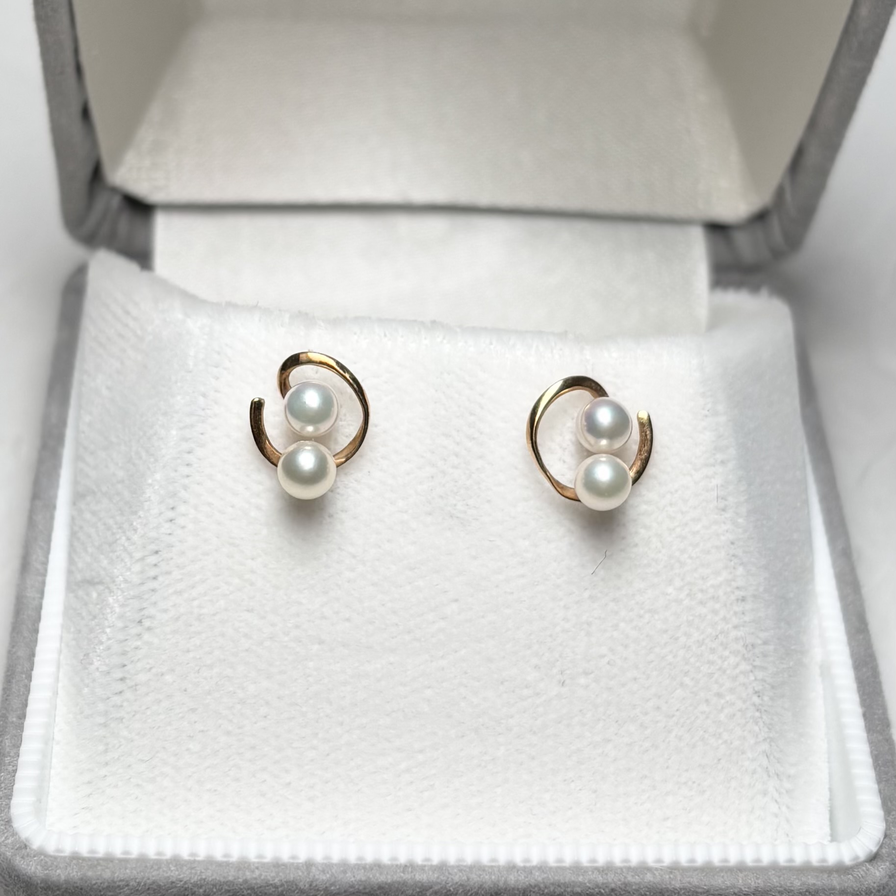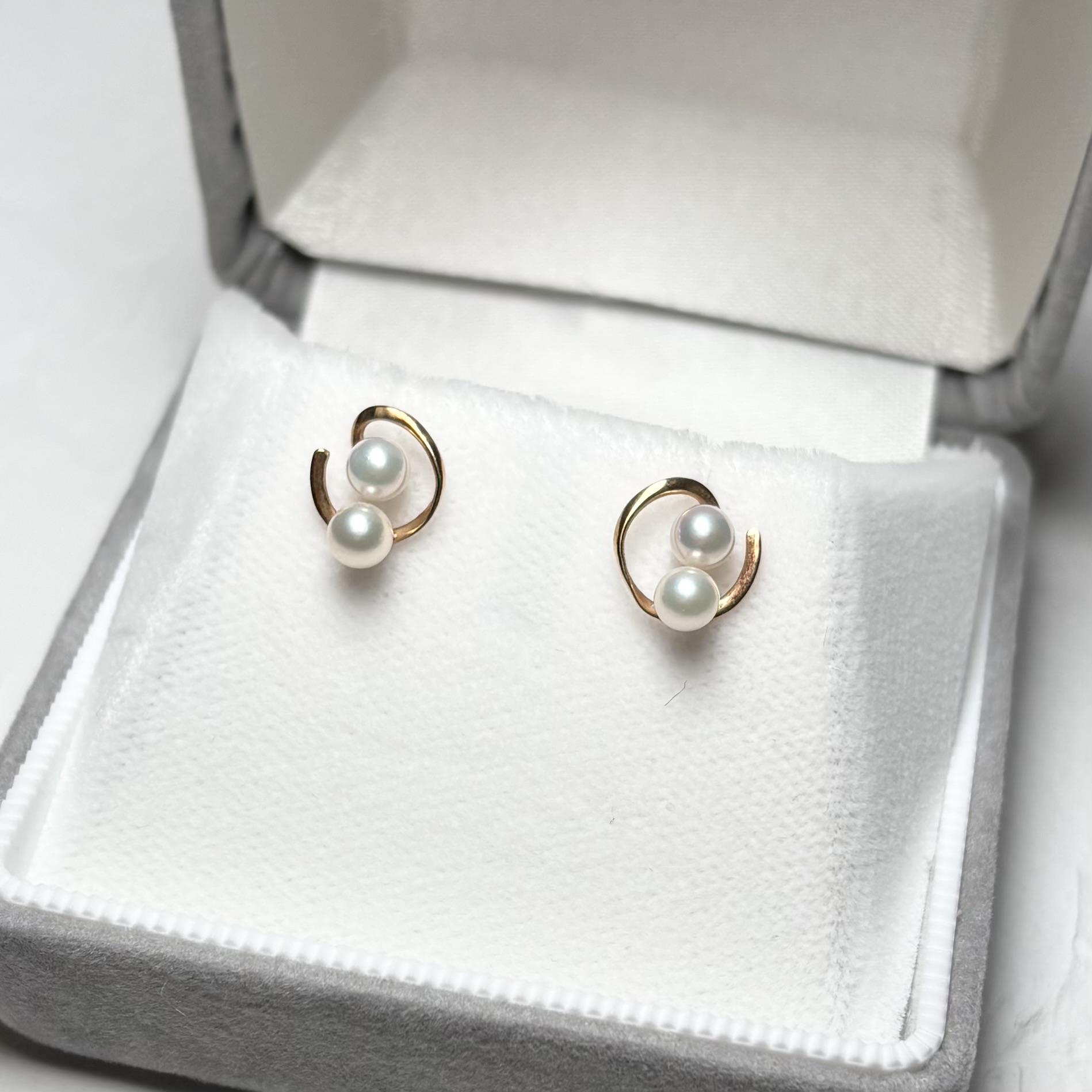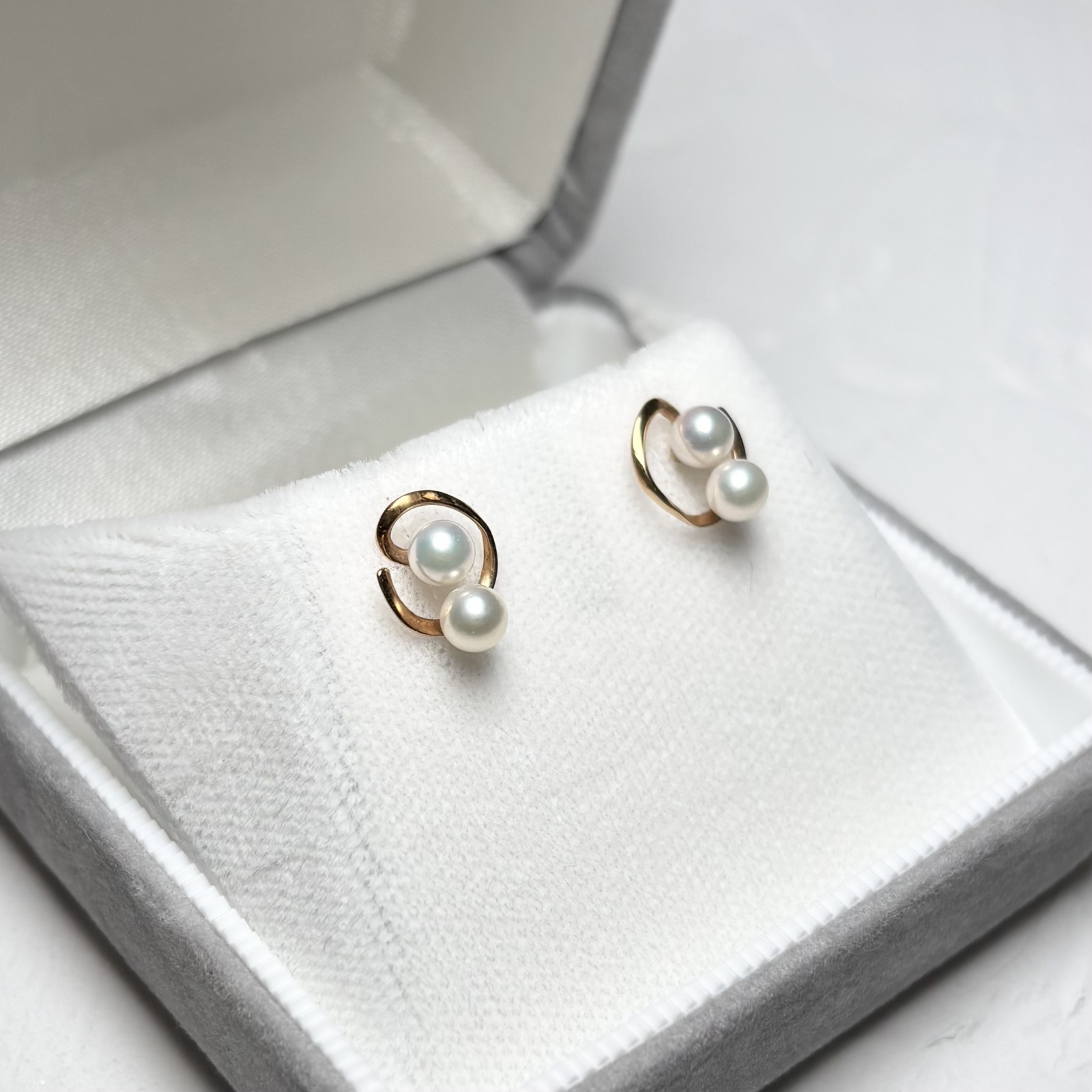 アコヤ真珠ベビーパールを2粒添えた、カーブラインのピアス。やさしくカーブしたゴールドラインと小粒パールの組み合わせが、シンプルながら上品にまとまるデザインです。