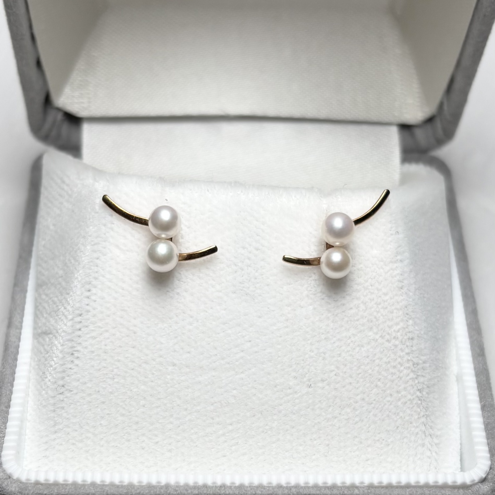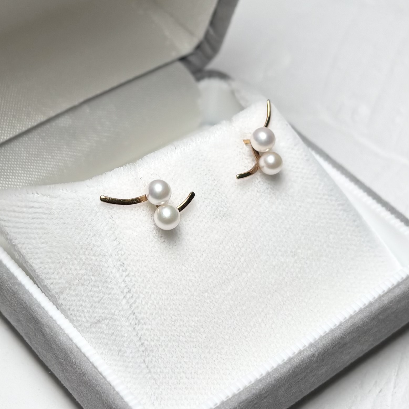 繊細なゴールドラインに、アコヤベビーパールを2粒添えた上品なパールピアスです。なめらかにカーブしたラインが耳元にやさしい立体感をつくり、シンプルながら洗練された印象にまとまります。