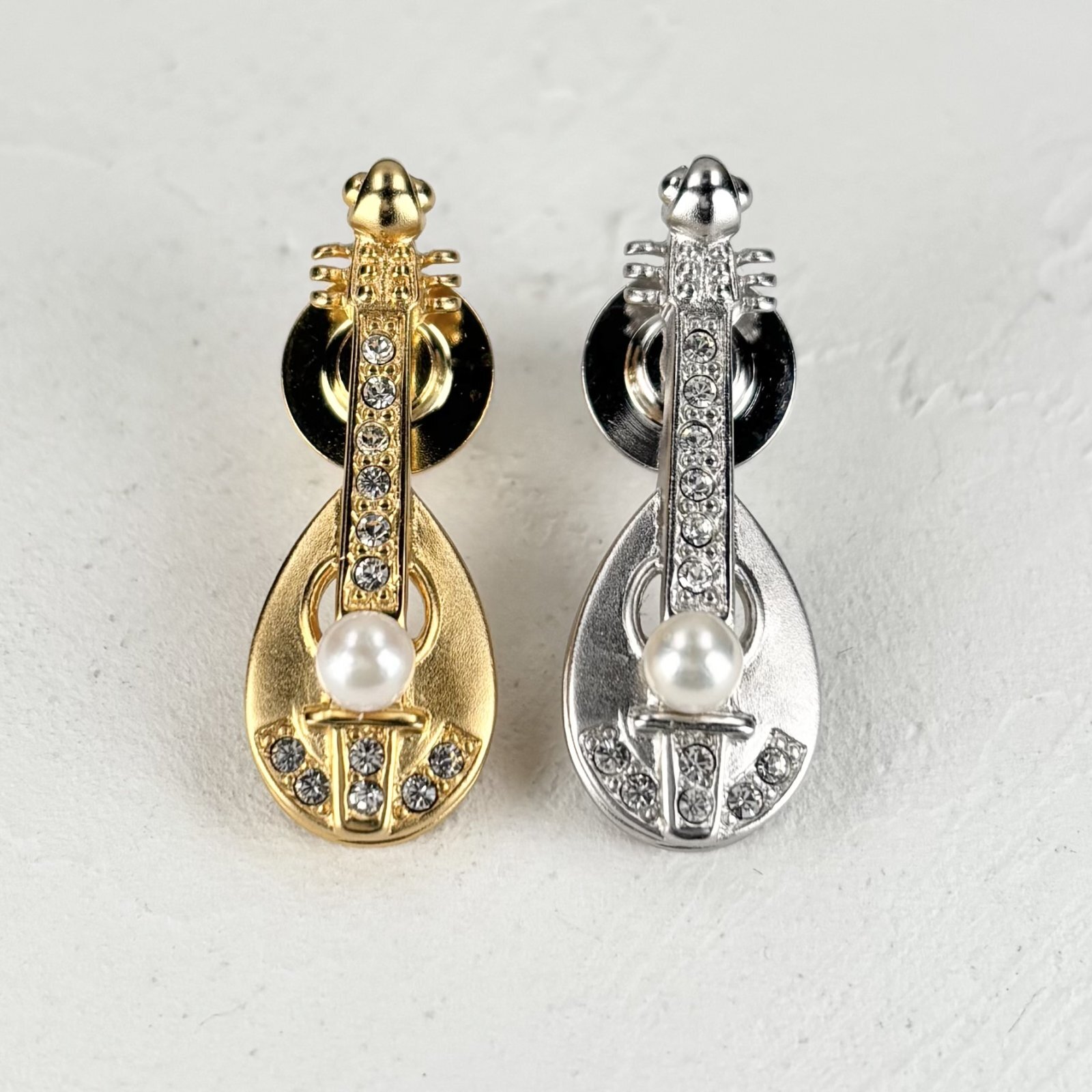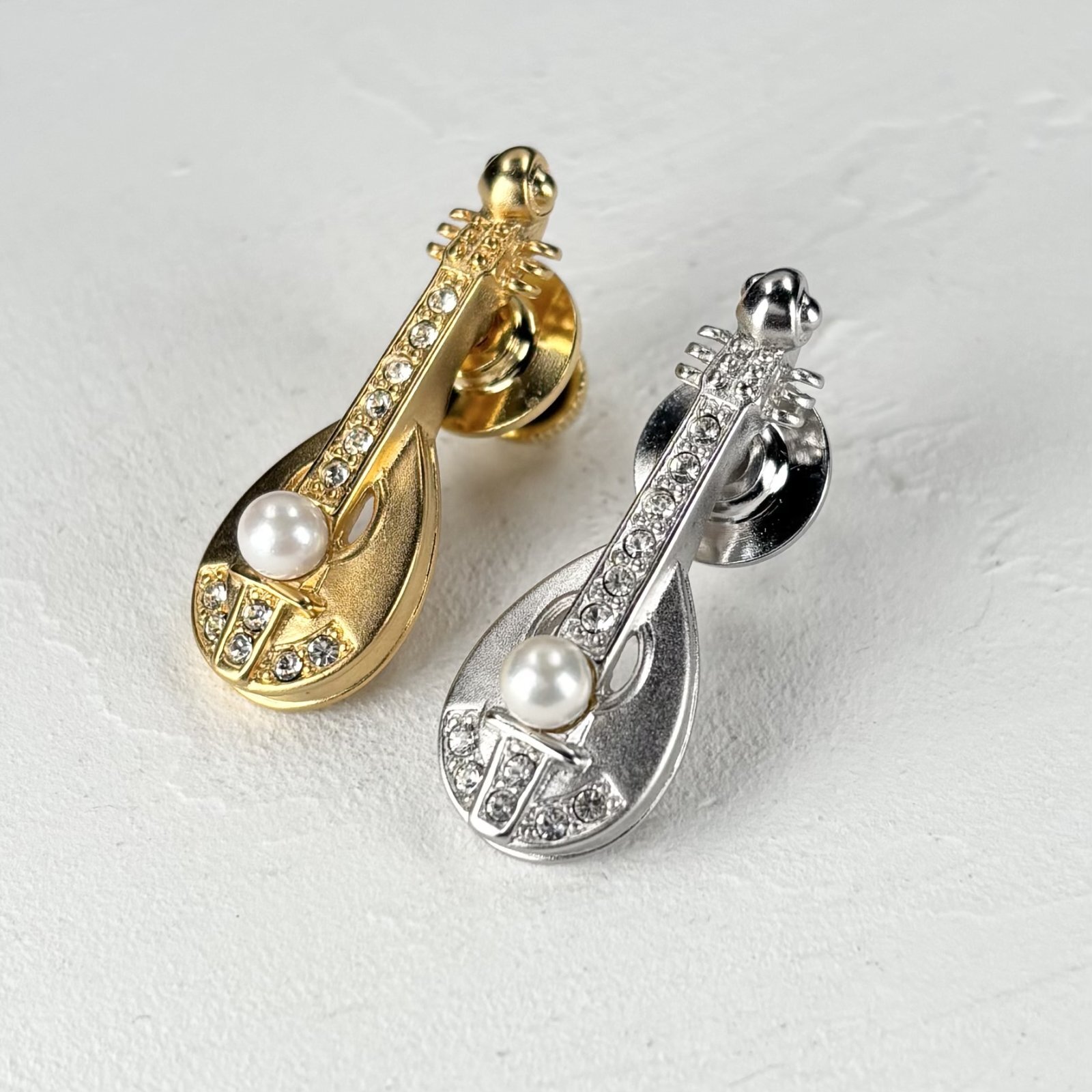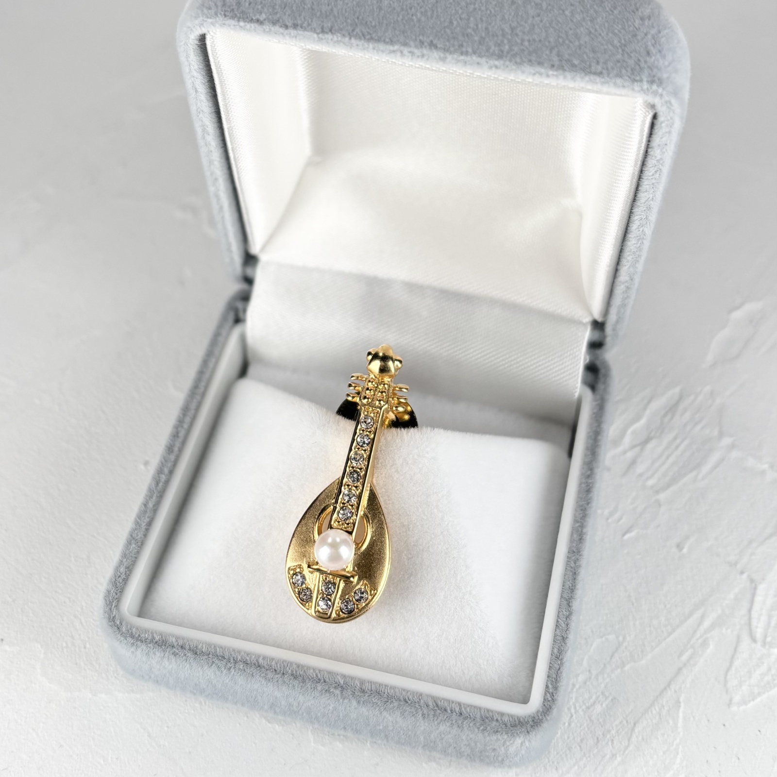 珍しい楽器マンドリンのパールピンブローチです。マンドリンの中央には上質なアコヤ本真珠を使用しています。弦にみたてた部分にはスワロフスキー社製のカットガラスが並んでいます。楽器を演奏される方に大人気の商品です。