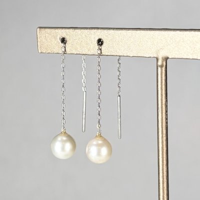 上質なアコヤ真珠をあしらったK14WGのロングチェーンピアスです。