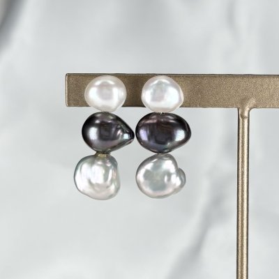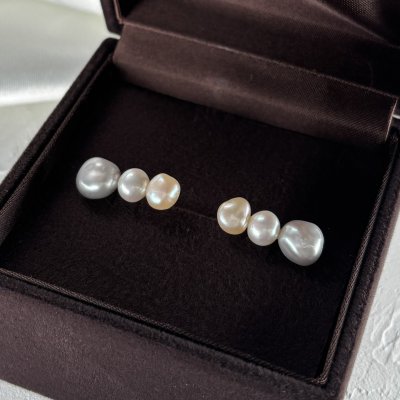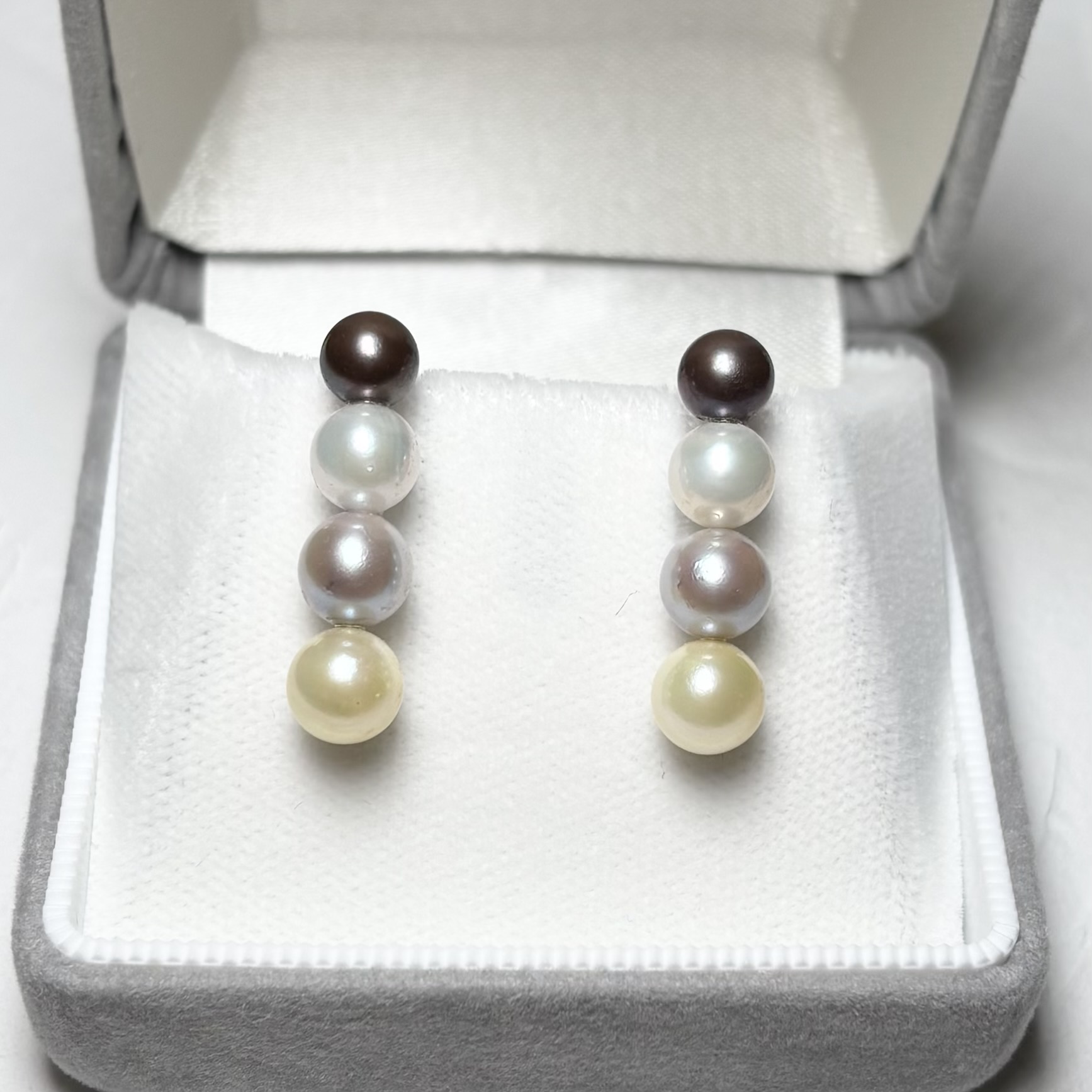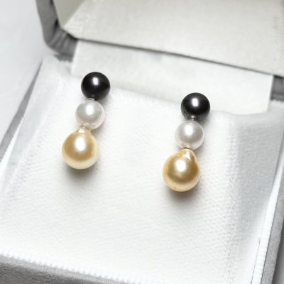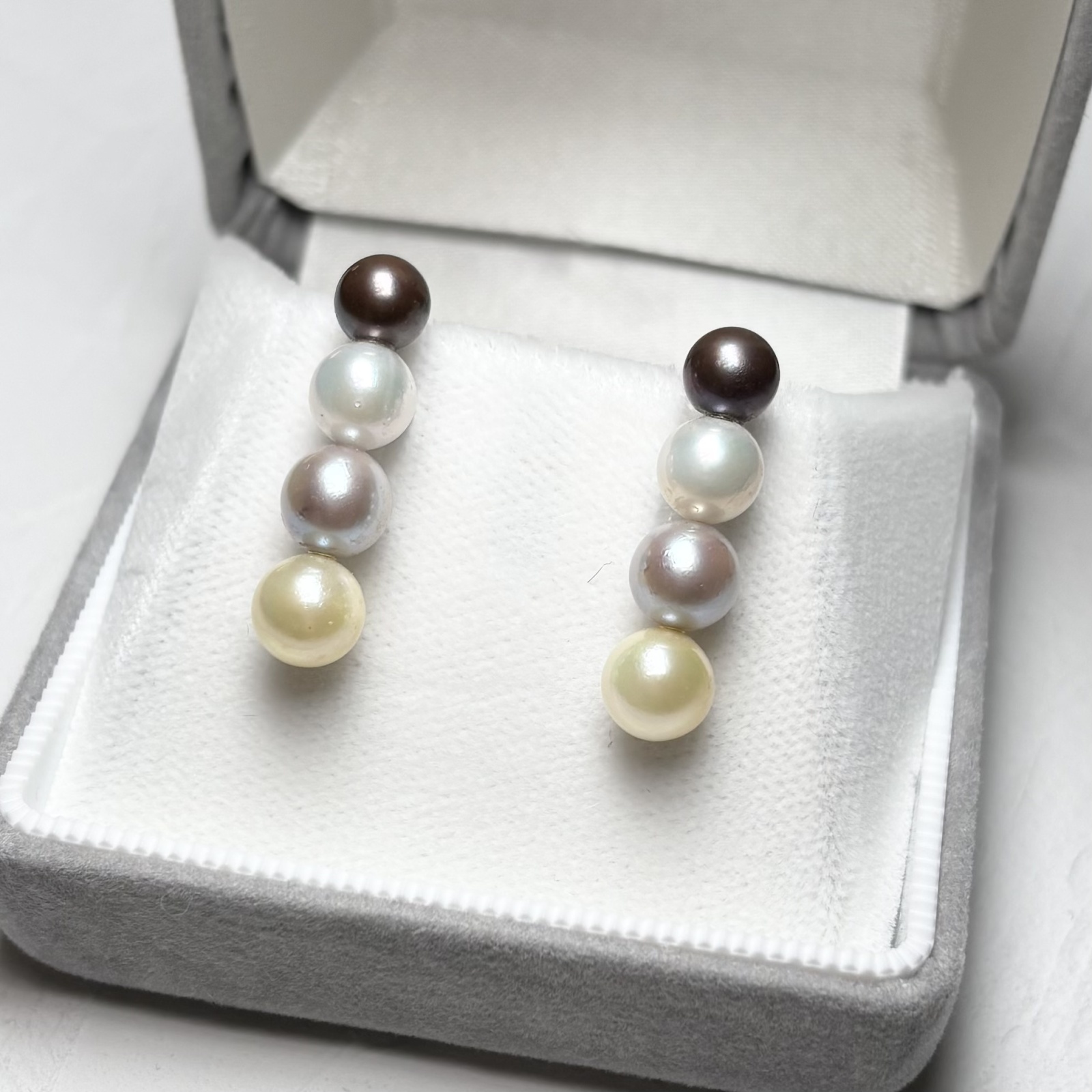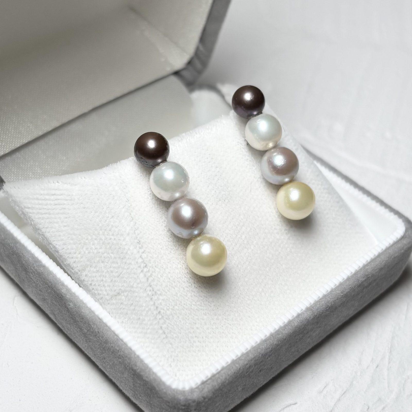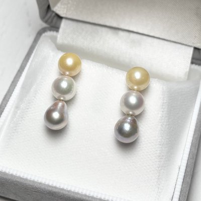 柔らかな輝きを放つアコヤ真珠を4粒重ねた4連パールピアス。1粒1粒、真珠の色を変えることで、シンプルでありつつ個性あるデザインに仕上げました。色の異なるアコヤ真珠を取り揃えたピアスは大変珍しく、当店だからこそできるオリジナルデザインです。鮮やかな色合いのパールはそれだけで目を惹きます。