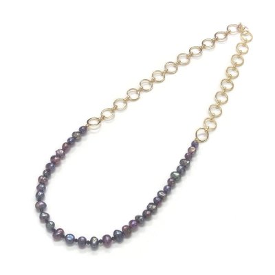 真珠を前にしたり、チェーンの部分を前にしたり、真珠とチェーンをハーフにしたり、Y字にしたりとお好きな着け方でお洒落を楽しんでいただけます。素材はブラスを使用しております。個性的な形をしたバロックケシパールと存在感のあるチェーンがスタイリッシュな印象をもたらしてくれます。夏のTシャツや秋冬のニットまで、シーズン問わず活躍するパールジュエリーです。