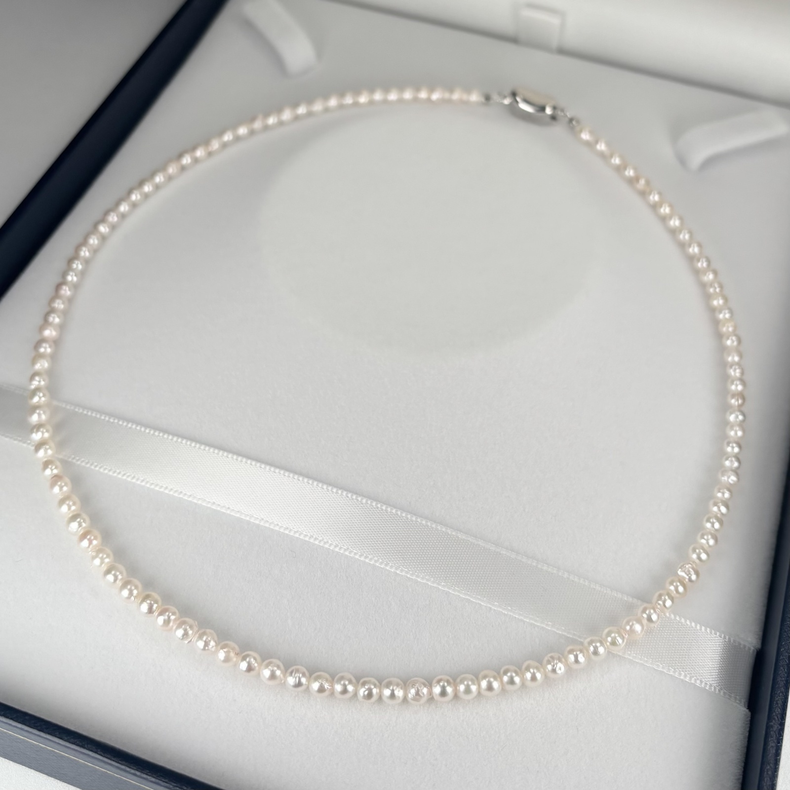 3.5-4mmの極小サイズながら、上質な照りとやわらかな光沢を持つアコヤ真珠をあしらったベビーパールネックレス。6mm以下のアコヤベビーパールは、近年では生産量が少なく、大変希少なサイズの真珠です。その小ささの中に、確かな品質と美しさが詰まった一本です。