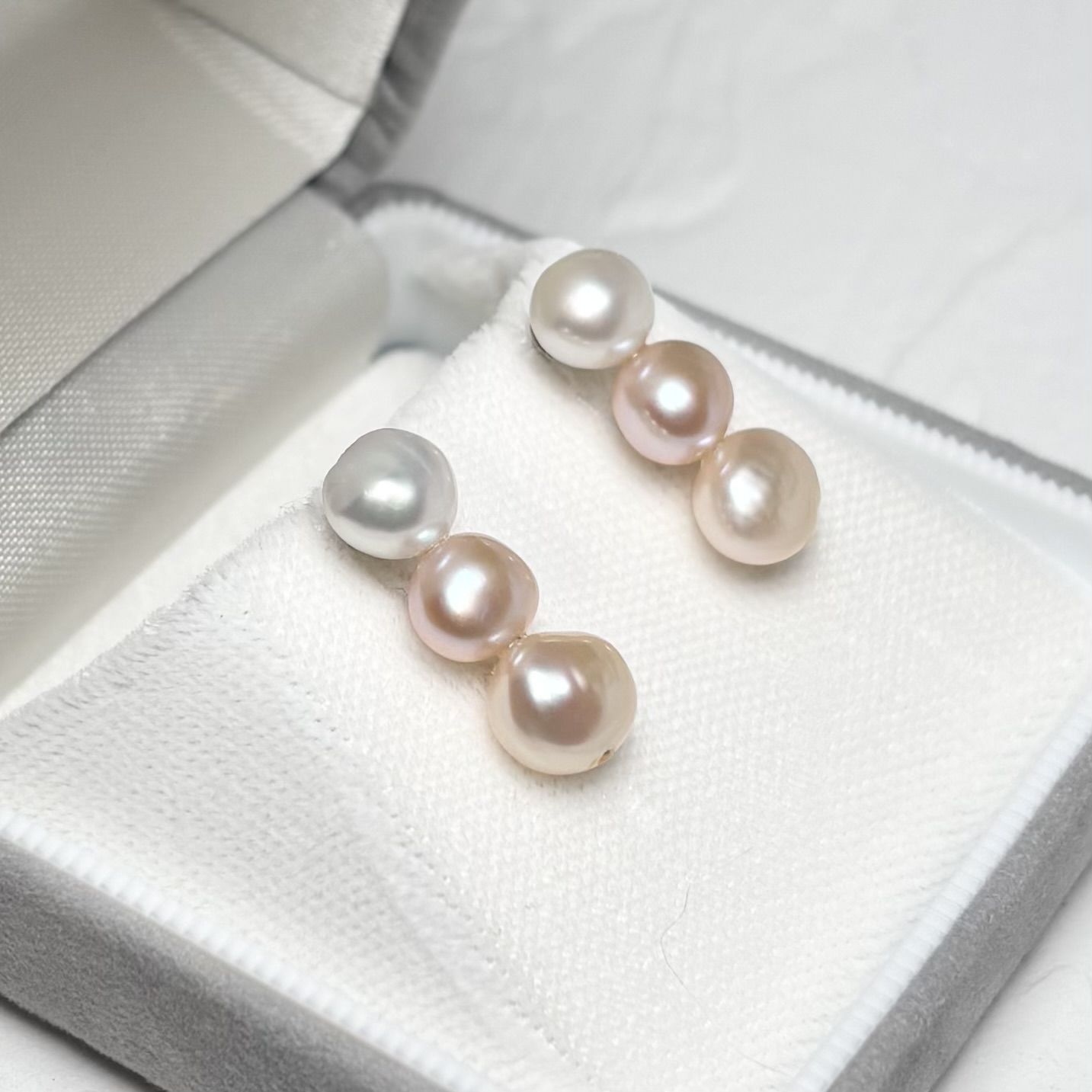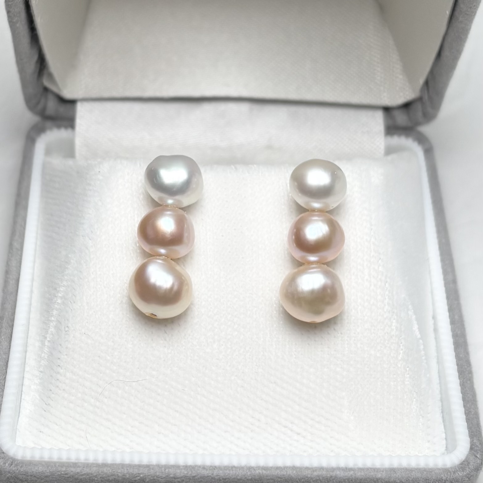 やさしい色合いの淡水真珠を3粒重ねた、上品で華やかな3連パールピアスです。ホワイト・ピンク・オレンジをバランスよく組み合わせ、ふんわりとやわらかな印象に仕上げました。