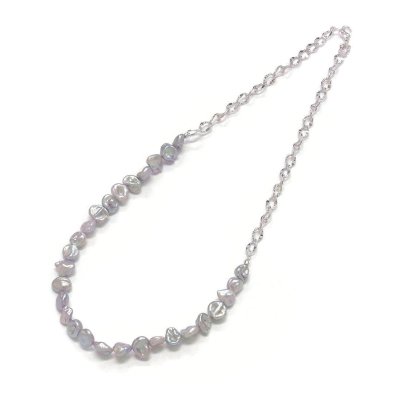 装着部分はデザイン性のあるマンテルを使用しております。棒状の金具を丸い輪に入れてとめるだけですので簡単に装着できます。遊び心あるデザインのパールネックレスはTシャツはもちろん、シャツやニットなどのシンプルなカジュアルスタイルにも上質なアクセントをつけてくれます。