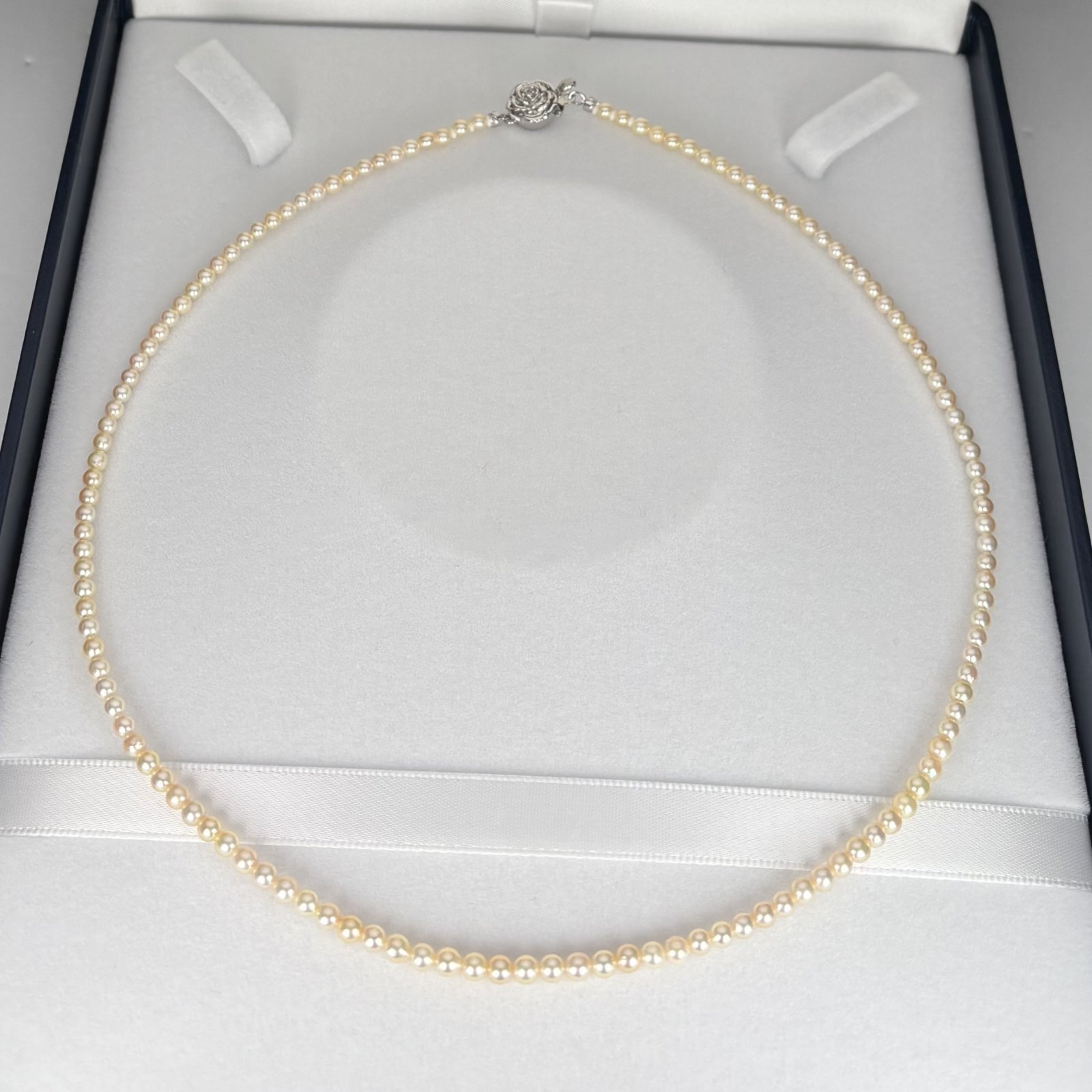 上品な光沢を放つクリーム〜ゴールドカラーのアコヤ真珠をあしらったベビーパールネックレスです。真珠は小粒サイズの3-3.5mm、アコヤ真珠ベビーパールの中でも小さなサイズで、生産量が年々少なくなっており希少な真珠です。ベビーパールはどのようなコーディネートにも合わせやすく他のジュエリーとの組み合わせや重ねづけも楽しむことができます。小さなサイズながらも照りが強く、アコヤ真珠の美しい輝きはしっかり感じられます。さりげなく上品な存在感のあるベビーパールネックレスはフォーマルシーンやオフィスシーンなど、幅広いシーンでお使いいただけます。ご購入いただいたネックレスの長さ調整、糸替え、クラスプの交換など各種アフターフォローを承っておりますので、安心して末永くご愛用いただけます。