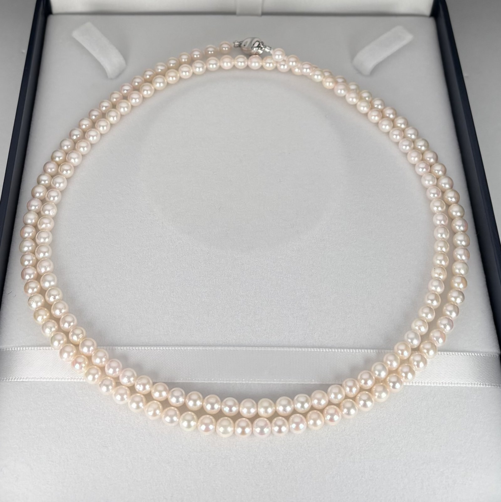 照りが良く巻きが美しいアコヤ本真珠ロングパールネックレスです。長さは約83.5cmで胸元あたりにくる長さですので、1連や2連、重ね付けなどコーディネートに合わせてお洒落を楽しんでいただけます。真珠は現在、生産量が少なく希少な5-5.5mmのベビーパールを使用しております。程よい存在感があり、普段にも使いやすいサイズ感です。フォーマルはもちろん、普段使いやオフィスシーンにもさりげなく上品なアクセントをつけてくれます。ネックレスの長さ調整、糸替え、クラスプの交換など各種アフターフォローを承っておりますので、安心して末永くご愛用いただけます。