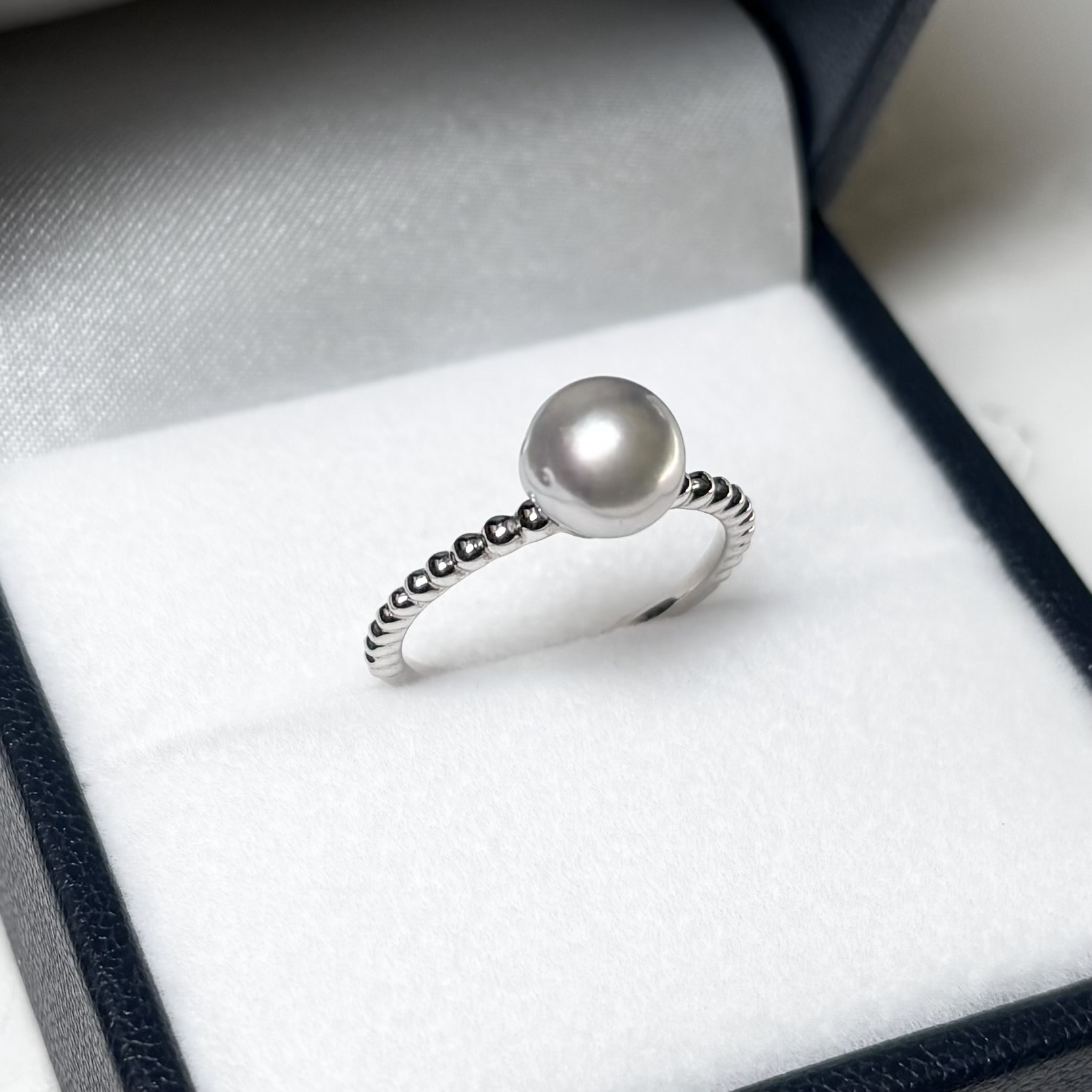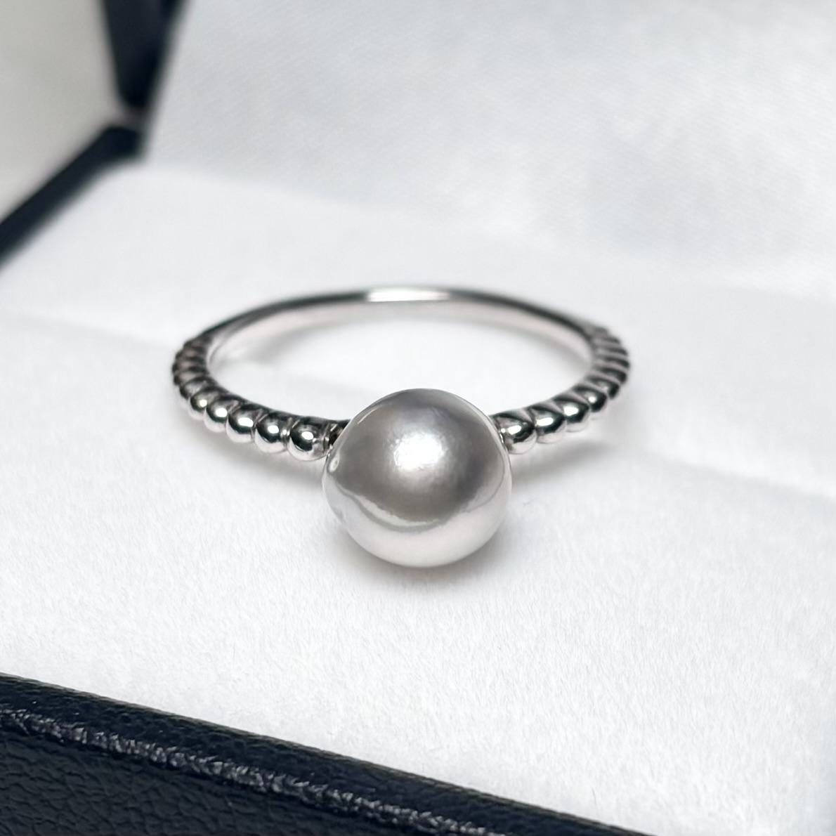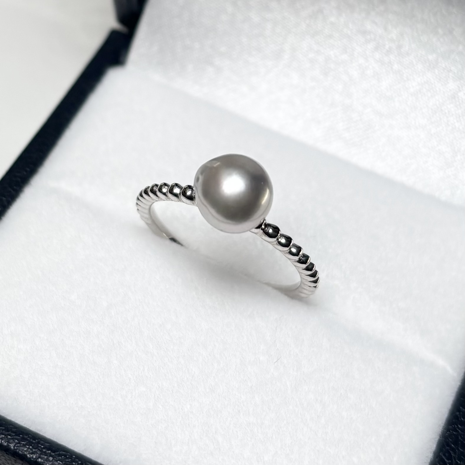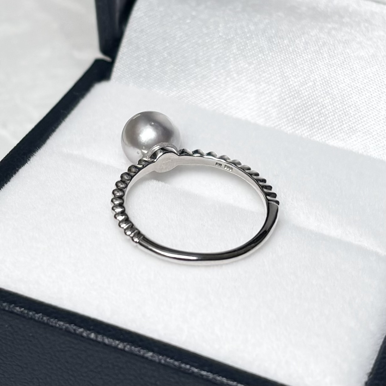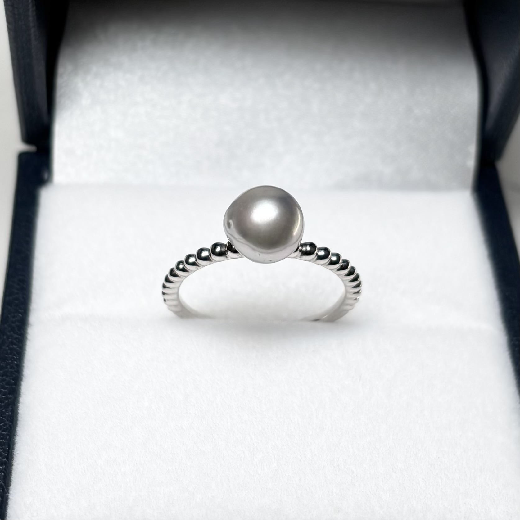 希少なナチュラルグレーのアコヤ真珠をあしらった、シルバー製のパールリング。7mmサイズのバロックパールは、巻き・照りともに申し分ない品質で、自然が生んだ色合いの奥行きと艶めきを存分に楽しめます。