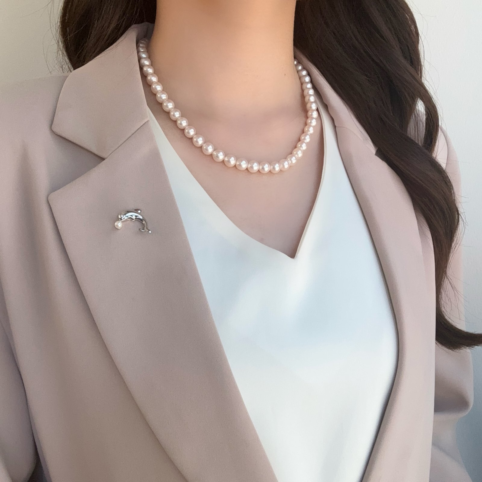 愛らしいイルカにアコヤ真珠を一粒あしらった、遊び心と上品さを兼ね揃えたピンブローチ。