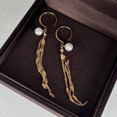 耳元でふんわりと揺れる、上質なアコヤ真珠のチェーンピアス繊細なゴールドチェーンが真珠の美しさを引き立て、シンプルながらも洗練された印象に。アコヤ真珠特有のやわらかな艶が、顔まわりに自然な明るさと上品さを添えてくれます。7-7.5mmの程よいサイズ感で、主張しすぎず、日常にも取り入れやすいバランスのよさが魅力です。